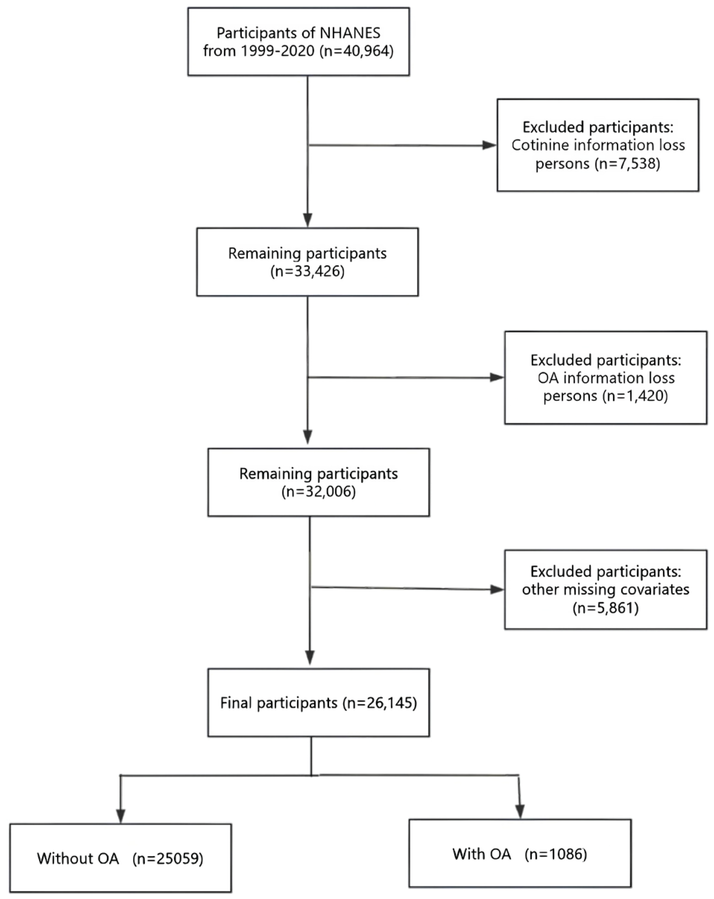 This study employed a pooled analysis of secondary data from the National Health and Nutrition Examination Survey (NHANES) covering the period from 1999 to 2020 among US adults aged 20–54 years (n=26145). The NHANES, coordinated by the National Center for Health Statistics (NCHS), is a comprehensive survey designed to assess the health and nutritional status of the non-institutionalized population in the United States. The survey uses a nationally representative sampling design that uses stratified, multistage probability cluster sampling to ensure a diverse and representative sample. This is achieved through standardized household interviews covering demographics, medical history, and lifestyle, as well as on-site physical examinations, laboratory tests, and anthropometric measurements among the non-institutionalized US population. The NHANES study protocols received ethical approval from the NCHS Research Ethics Review Board, and written informed consent was obtained from all participants. As this research involves secondary analysis of pre-existing data, additional approval from an Institutional Review Board was deemed unnecessary. All procedures in this study were performed in line with the principles of the Declaration of Helsinki. Furthermore, the reporting of this cross-sectional research follows the Strengthening the Reporting of Observational Studies in Epidemiology (STROBE) guidelines. We used data from eleven consecutive cycles (1999–2020) of the NHANES. Our analysis encompassed participants aged 20–54 years who had successfully completed all necessary assessments (n=40964). We excluded individuals with missing data on serum cotinine (n=7538), missing data on OA (n=1420), and other missing covariates (n=5861). The final study sample consisted of 26145 participants. The use of data from 1999 to 2020 was driven by the need for a sufficiently large sample size to ensure adequate statistical power for detecting associations between tobacco smoke exposure and early-onset OA, given the relatively low prevalence of early-onset OA in the population. The flow of participant selection is depicted in Figure 1.