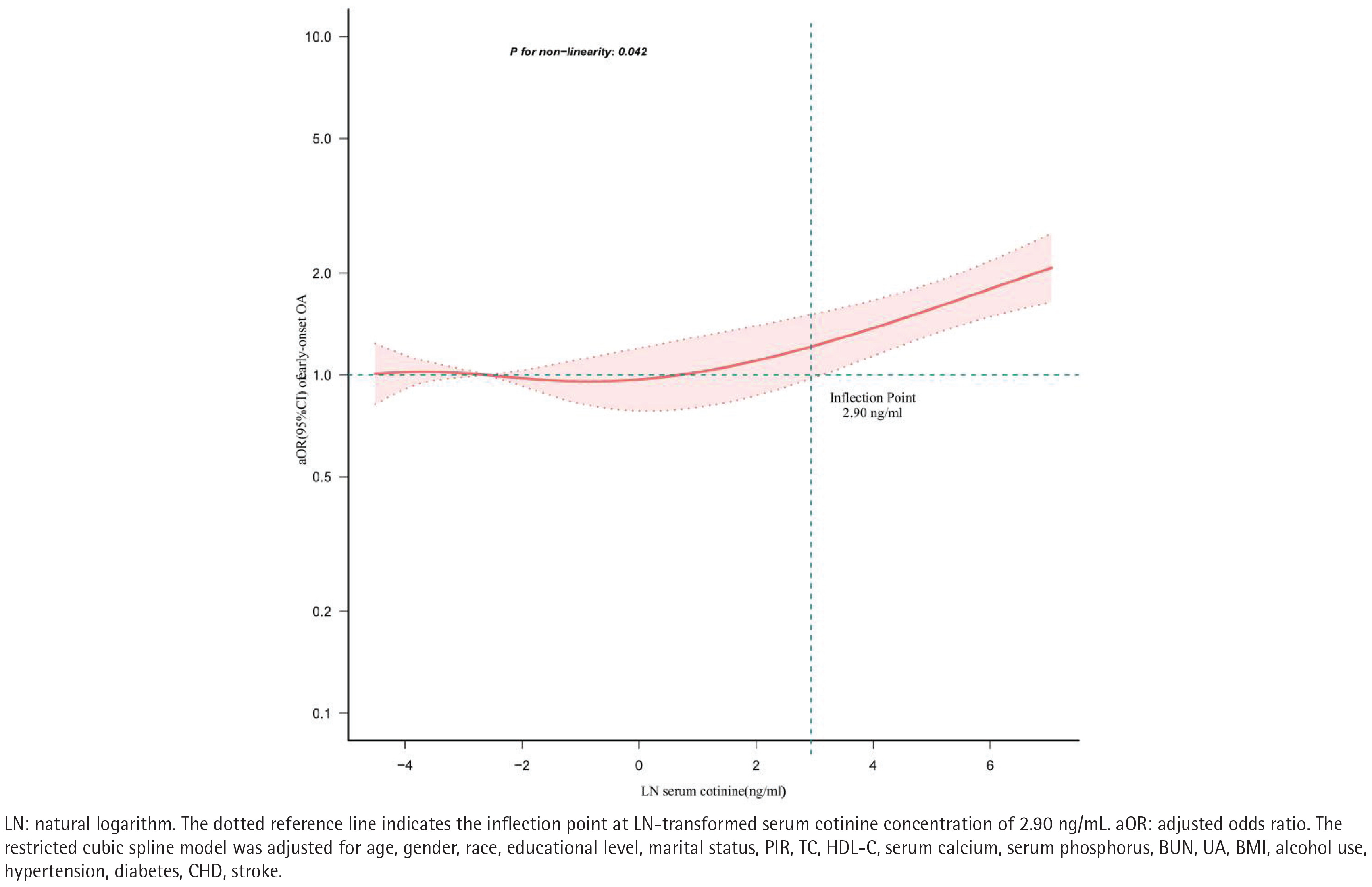 This large cross-sectional study of individuals aged 20–54 years in the United States identified a nonlinear, positively saturated association between tobacco smoke exposure and early-onset OA. Specifically, when LN-transformed serum cotinine levels exceeded 2.90 ng/mL, each additional 1 ng/ mL increment in LN-transformed serum cotinine was associated with a 38% higher likelihood of developing early-onset OA.