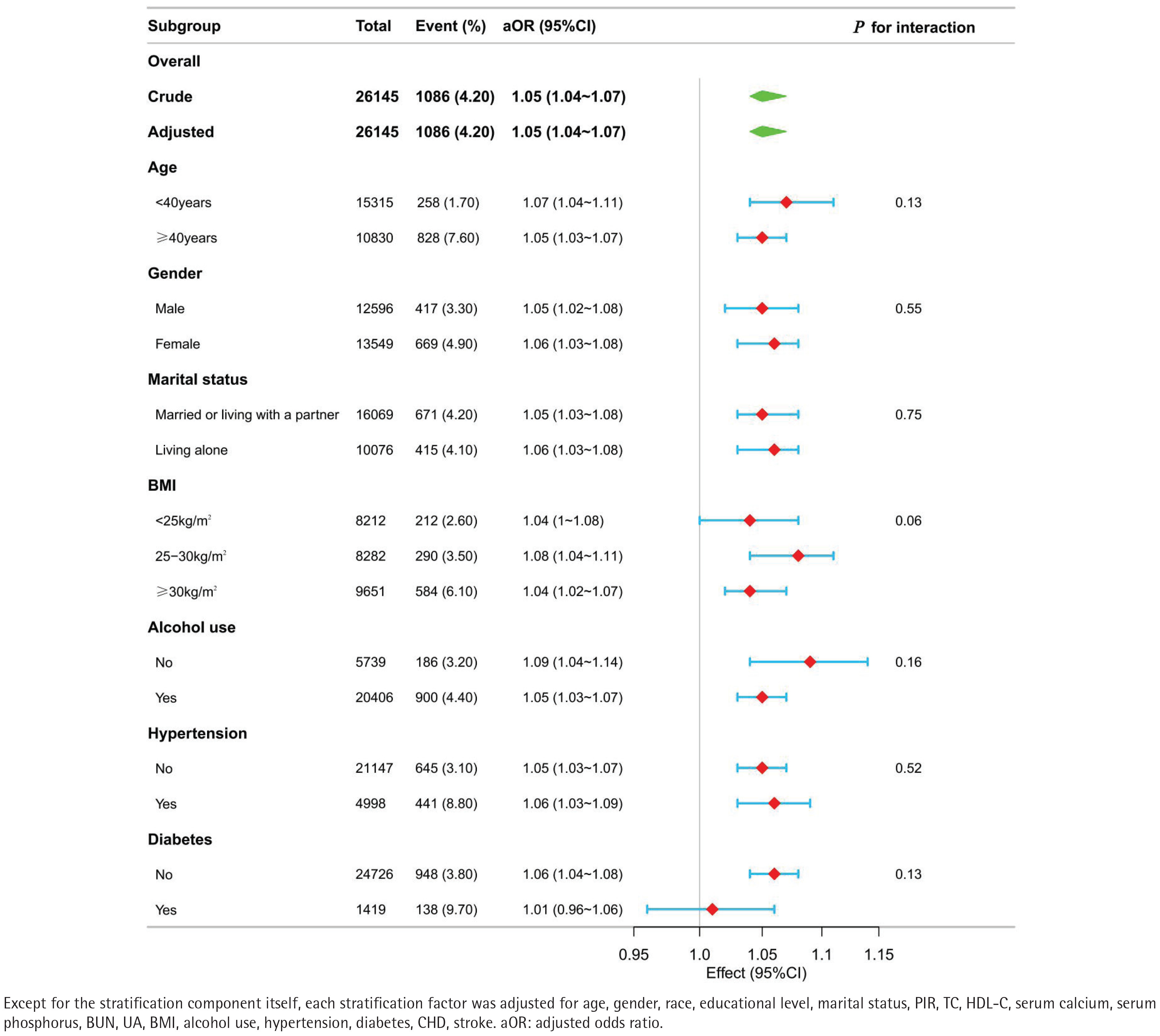 Except for the stratification component itself, each stratification factor was adjusted for age, gender, race, educational level, marital status, PIR, TC, HDL-C, serum calcium, serum phosphorus, BUN, UA, BMI, alcohol use, hypertension, diabetes, CHD, stroke. aOR: adjusted odds ratio.
