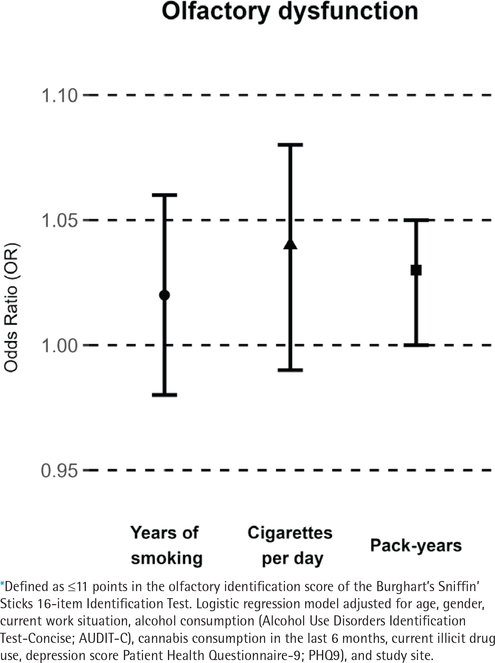 We first determined the prevalence of olfactory dysfunction based on an objective olfactory function test in adult smokers in Switzerland participating in a smoking cessation trial. Secondly, we tested the association between their smoking history (years of smoking and cigarettes per day, alone and jointly measured as pack-years) and olfactory function.