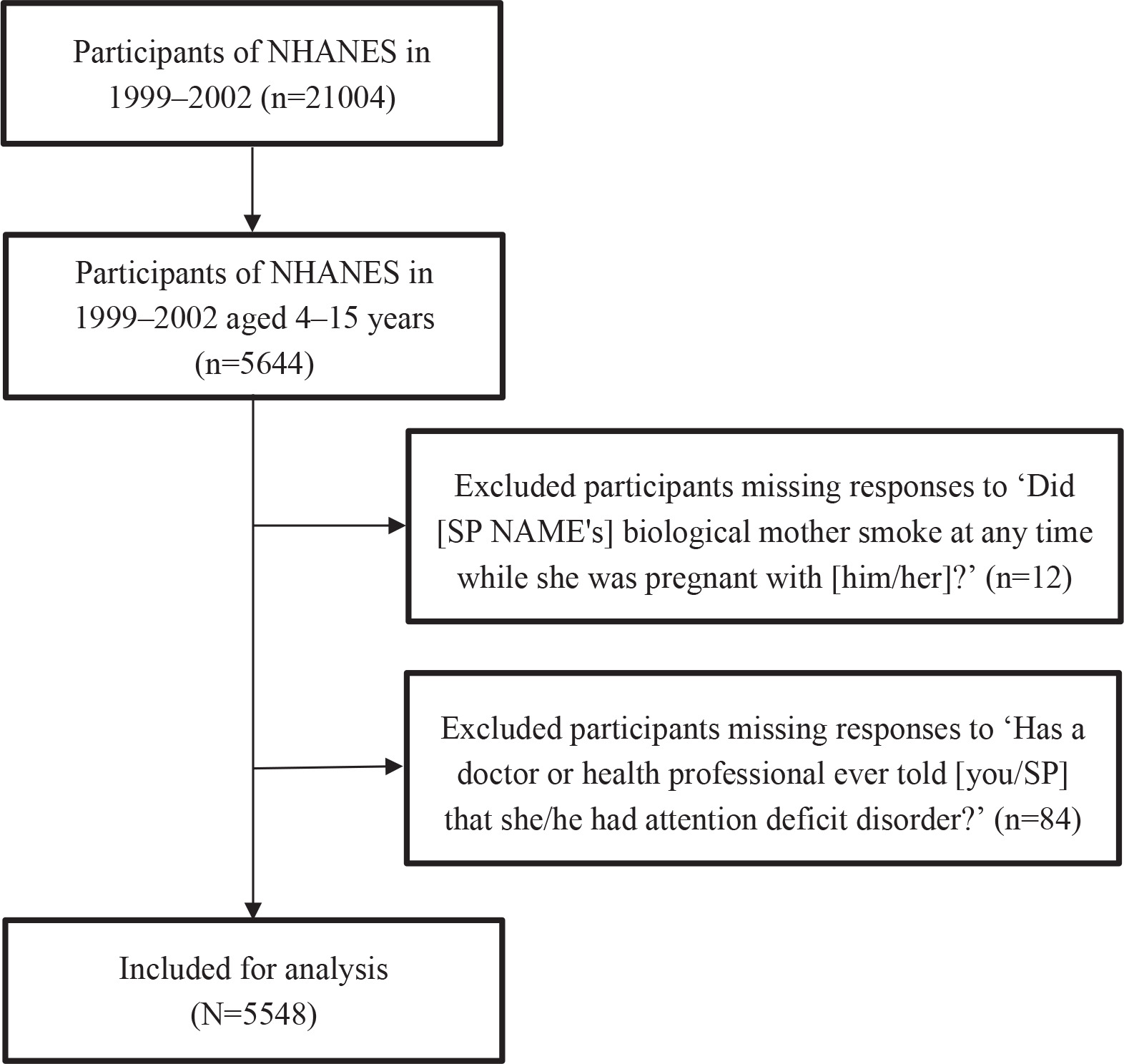 We used NHANES data from 1999 to 2002, which included comprehensive ADHD assessments in children. A lower age limit of 4 years was implemented due to the fact that inquiries concerning ADHD were exclusively posed to children aged ≥4 years. Conversely, an upper age limit of 15 years was established because the inquiry regarding maternal smoking was posed only to children up to the age of 15 years. From an initial 5644 eligible participants, we excluded 12 individuals with missing ADHD data and 84 with incomplete maternal smoking records, yielding a final analytical sample of 5548 participants. Figure 1 presents a flow chart that illustrates the process of participant selection, illustrating the inclusion and exclusion criteria.