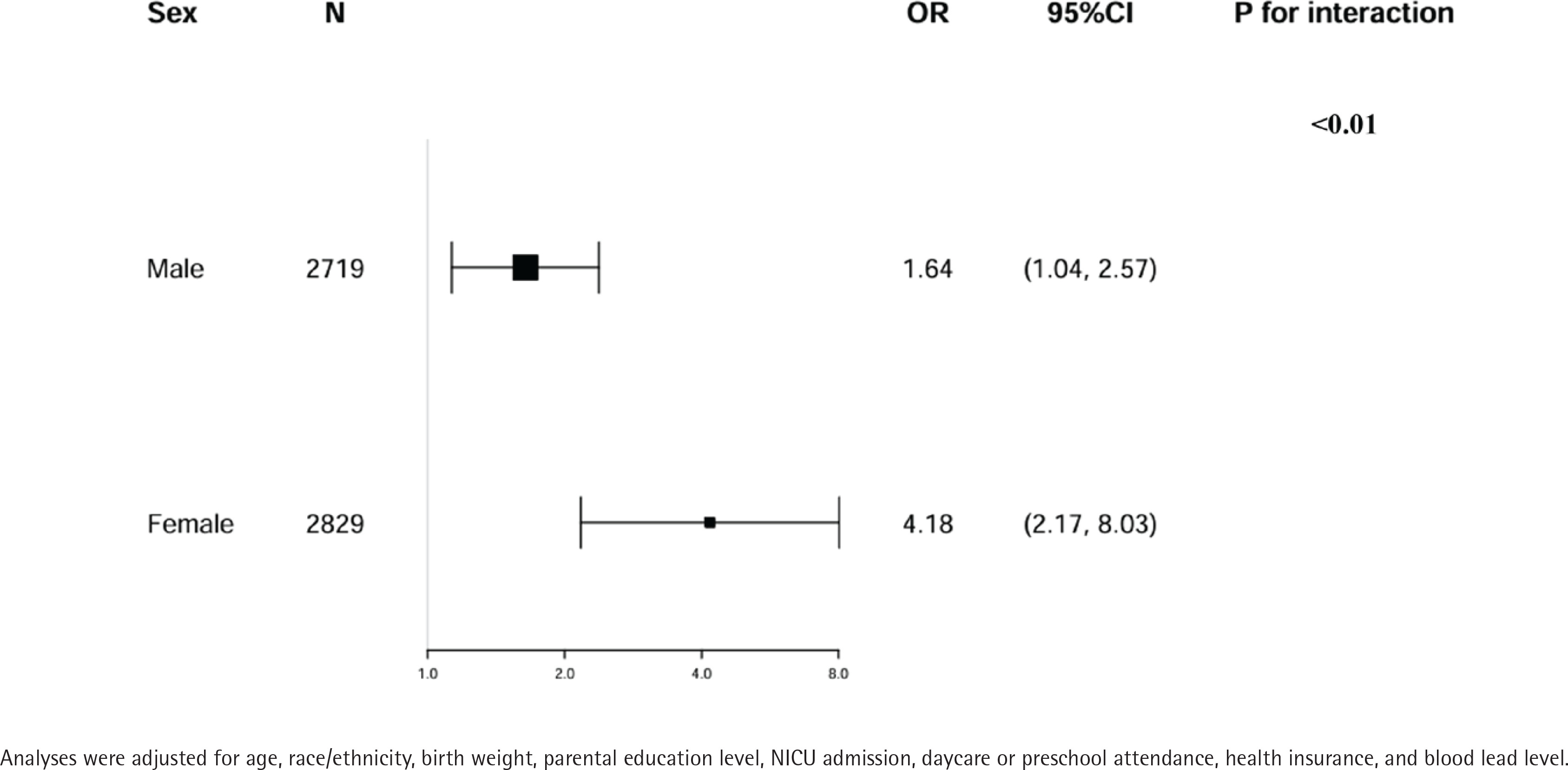 Stratification analyses and interaction analysis were conducted, shown in Figures 2 and 3. These analyses were stratified by age, sex, race/ethnicity, birth weight, parental education level, NICU admission, daycare/preschool attendance, health insurance, and blood lead level, excluding the stratification variable. Age was categorized into four ranges: 4–6, 7–9, 10–12, and 13–15 years.