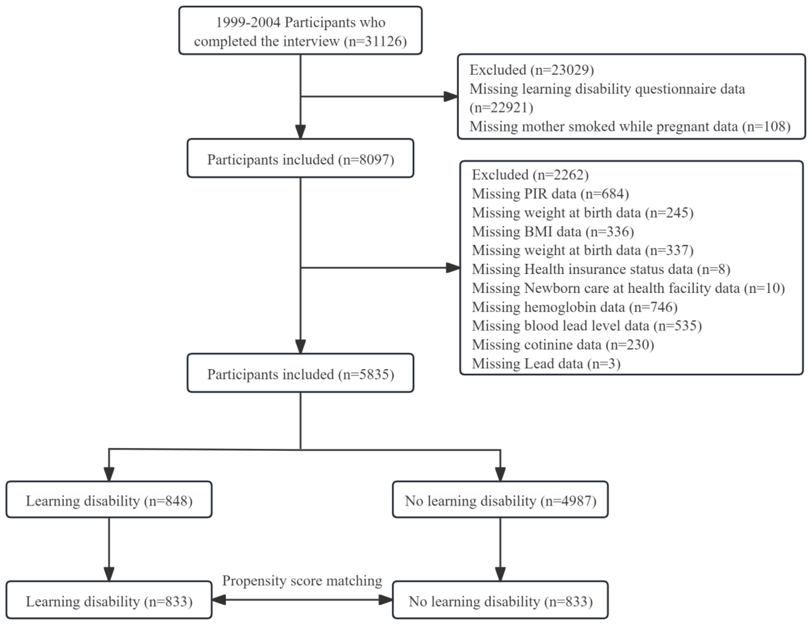 There were 31126 participants in the 1999–2004 NHANES database. In the final analysis, we included 5835 children and adolescents (aged 4–15 years) after excluding cases with incomplete information on confounders, learning disability questionnaires, and maternal smoking during pregnancy. Of them, 4987 (85.5%) had birth mothers who did not smoke throughout pregnancy, and 848 (14.5%) had mothers who smoked during pregnancy. Eight hundred thirty-three matched pairs with balanced patient characteristics were found via propensity score matching (Figure 1).