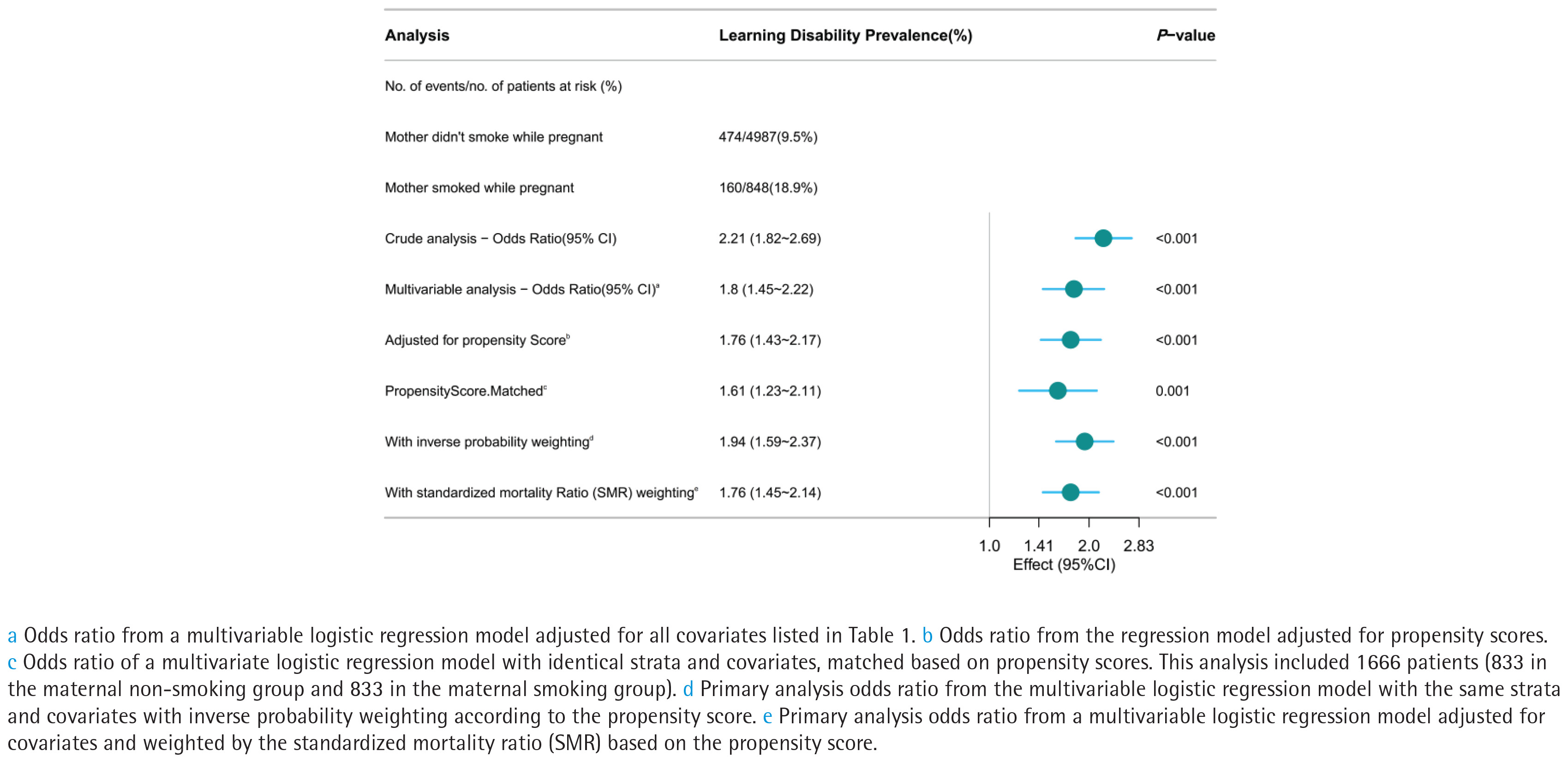 Overall, 10.9% of people had learning problems (634/5835). In the mother smoking group, the prevalence of learning difficulties was 18.9% (160/848), while in the maternal non-smoking group, it was 9.5% (474/4987) (Figure 3). LD had higher odds in the maternal smoking group than in the non-smoking group in the unadjusted model (OR=2.21; 95% CI: 1.82–2.69, p<0.001). The logistic regression’s OR for mother smoking during pregnancy, after controlling for covariates, was 1.8 (95% CI: 1.45–2.22, p<0.001). Among the 1666 matched participants, the odds ratio adjusted for propensity score was 1.76 (95% CI: 1.43–2.17, p<0.001). In a multivariate logistic regression model based on propensity score matching with identical stratification and covariates, the OR was 1.61 (95% CI: 1.23–2.11, p=0.001). Both IPTW (OR=1.94; 95% CI: 1.59–2.37, p<0.001) and SMRW (OR=1.76, 95% CI: 1.45–2.14, p<0.001) analyses demonstrated a positive association between maternal smoking during pregnancy and the prevalence of learning disabilities (Figure 3).