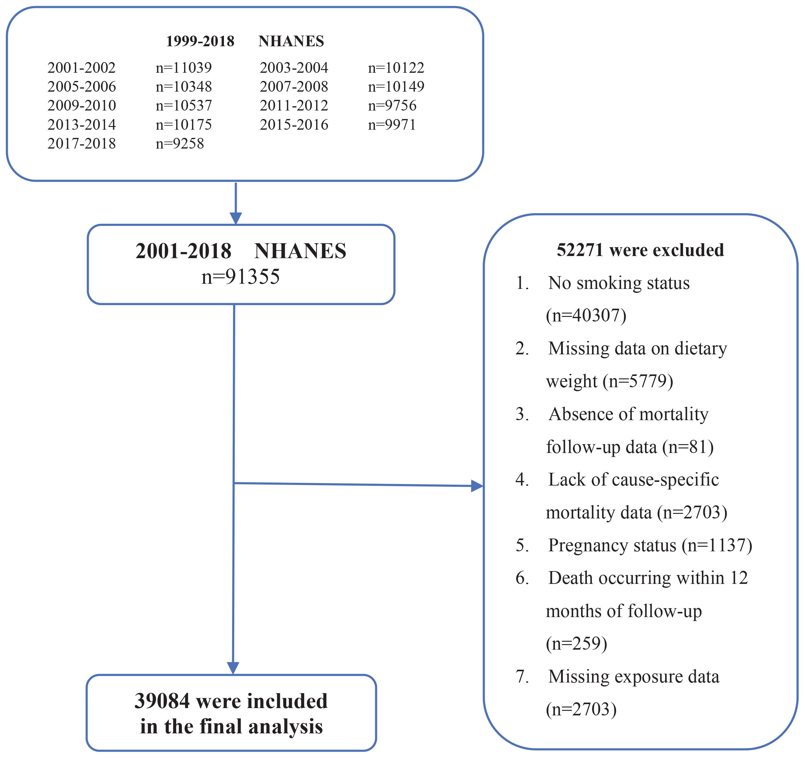 This study is a retrospective analysis of secondary data from the cross-sectional National Health and Nutrition Examination Survey (NHANES), which is administered by the National Center for Health Statistics (NCHS). NHANES employs a sophisticated multistage sampling design to obtain nationally representative samples of the US population using stratification and probability sampling methods. This database primarily serves to evaluate both health parameters and nutritional metrics across the US population thereby encompassing all age demographics11. The NCHS authorized all research procedures, and written informed consent was secured from every enrolled individual. Consequently, this investigation strictly complied with established ethical standards thus eliminating the necessity for supplementary ethics evaluations. From an initial pooled sample of 91355 individuals, we excluded 52271 participants for the following reasons: no smoking status (n=40307), missing dietary weights (n=5779), absent mortality follow-up (n=81) or cause-specific mortality data (n=2703), pregnancy (n=1137), death within 12 months of follow-up (n=259), and missing exposure data (n=2703). Consequently, 39084 participants were included in the final analysis.