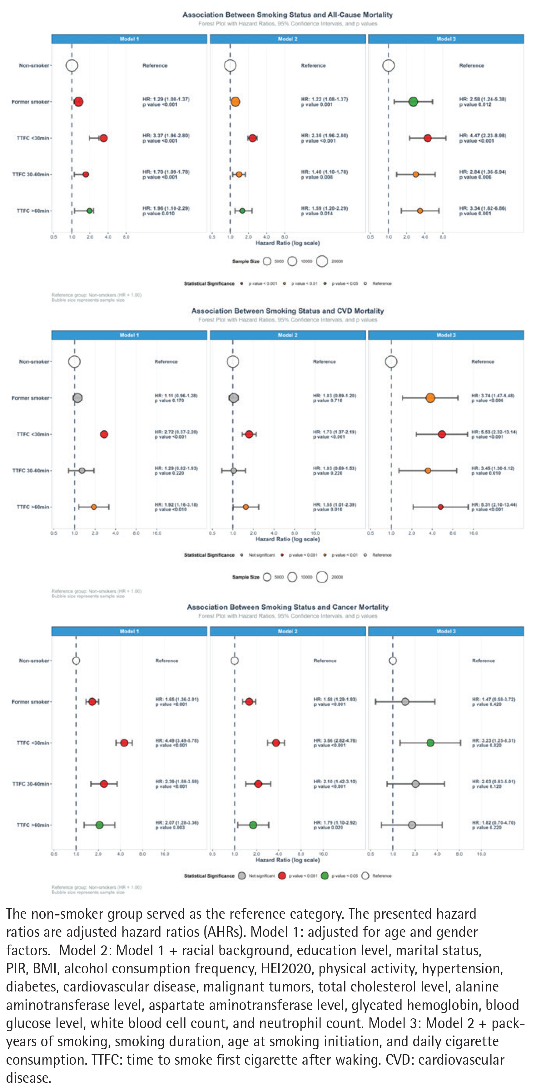 In Model 1, former smokers showed a higher risk of cancer mortality than non-smokers (AHR=1.65; 95% CI: 1.36–2.01, p<0.001). A dose–response relationship was observed between TTFC and cancer mortality, with AHR of 4.49 (95% CI: 3.49–5.78; p<0.001) for TTFC <30 min, 2.39 (95% CI: 1.59–3.59; p<0.001) for 30–60 min, and 2.07 (95% CI: 1.28–3.36; p=0.003) for >60 min (Table 4 and Figure 4). A Kaplan–Meier analysis, using the unadjusted model, supported these findings (Figure 2).
