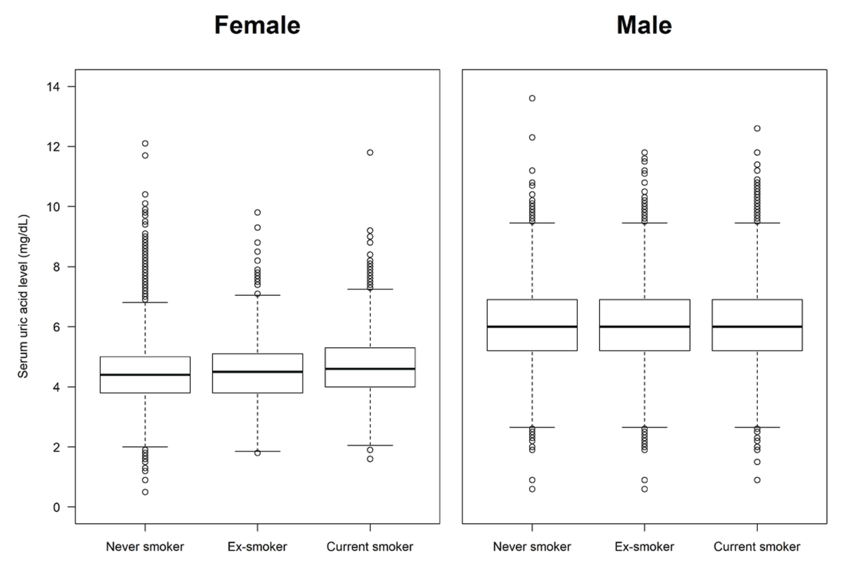 A total of 29516 participants were included in the analysis for hyperuricemia (study population A). The mean age of the participants was 46.0 years (SD=16.2). Males accounted for 51.4% of the population, and females accounted for 48.6%. Regarding smoking status, 58.5% were never smokers, 20.4% were ex-smokers, and 21.1% were current smokers. The overall prevalence of hyperuricemia was 13.9%. In the analysis for gout (study population B, n=12626), the prevalence of doctor-diagnosed gout was 2.0%. The demographic, health behavioral, and clinical characteristics of the study population are summarized in Table 1. The smoking status was significantly different between participants with and without hyperuricemia (p<0.001), and was also different between those with and without gout (p<0.001). The box plots of serum uric acid levels by smoking status showed that levels tended to increase in the order never smoker, ex-smoker, and current smoker in females, but not in males (Figure 2).