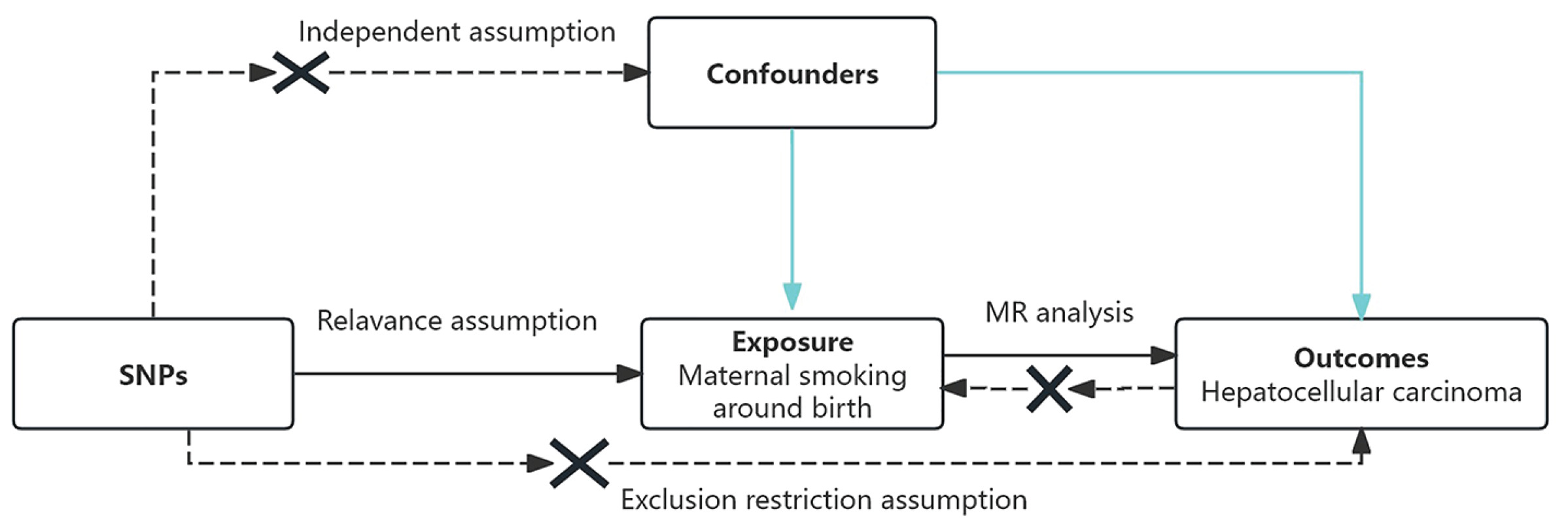 Observational research is inherently limited by confounding, lack of randomization, and potential reverse causation13. Although randomized controlled trials are the gold standard for observed inference, they are ethically infeasible in this context. Mendelian randomization (MR), which uses genetic variants as instrumental variables (IVs), offers a powerful alternative for observed inference. Because genetic variants are randomly allocated at conception according to Mendel’s laws, MR analyses are less prone to confounding and reverse causation14. The growing availability of genome-wide association studies (GWAS) and meta-analyses has further expanded the utility of MR for examining observed relationships15. Two-sample MR leverages GWAS summary statistics from separate but comparable samples to estimate the potential effect of an exposure on an outcome. This study aimed to evaluate the potential relationship between maternal smoking around birth and offspring HCC risk in East Asians, using a bidirectional two-sample MR approach.