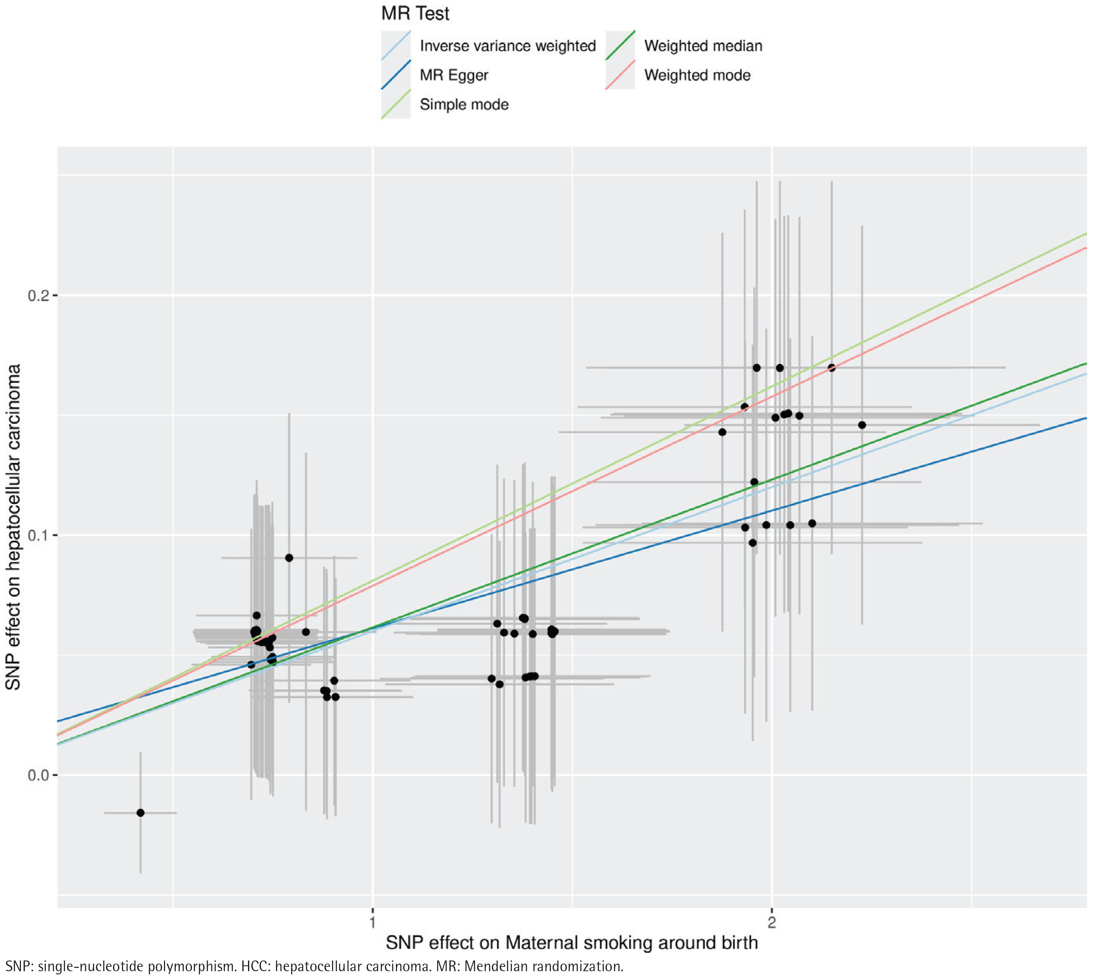 Nevertheless, several limitations should be acknowledged. First, the GWAS data for maternal smoking around birth were derived exclusively from East Asian populations, which may introduce ancestry-related bias and limit the generalizability of our findings to other ethnic groups. Second, in the reverse MR analysis, the MR-Egger model indicated notable horizontal pleiotropy among the IVs; however, such pleiotropy did not materially influence the estimates during maternal–fetal transmission. Third, the two-sample MR design may be vulnerable to over-identification bias, potentially inflating associations between SNPs and the exposure. Fourth, the IEU Open GWAS database does not classify maternal smoking around birth into more granular phenotypic subtypes (e.g. smoking intensity or frequency), preventing subtype-specific evaluations of HCC risk.