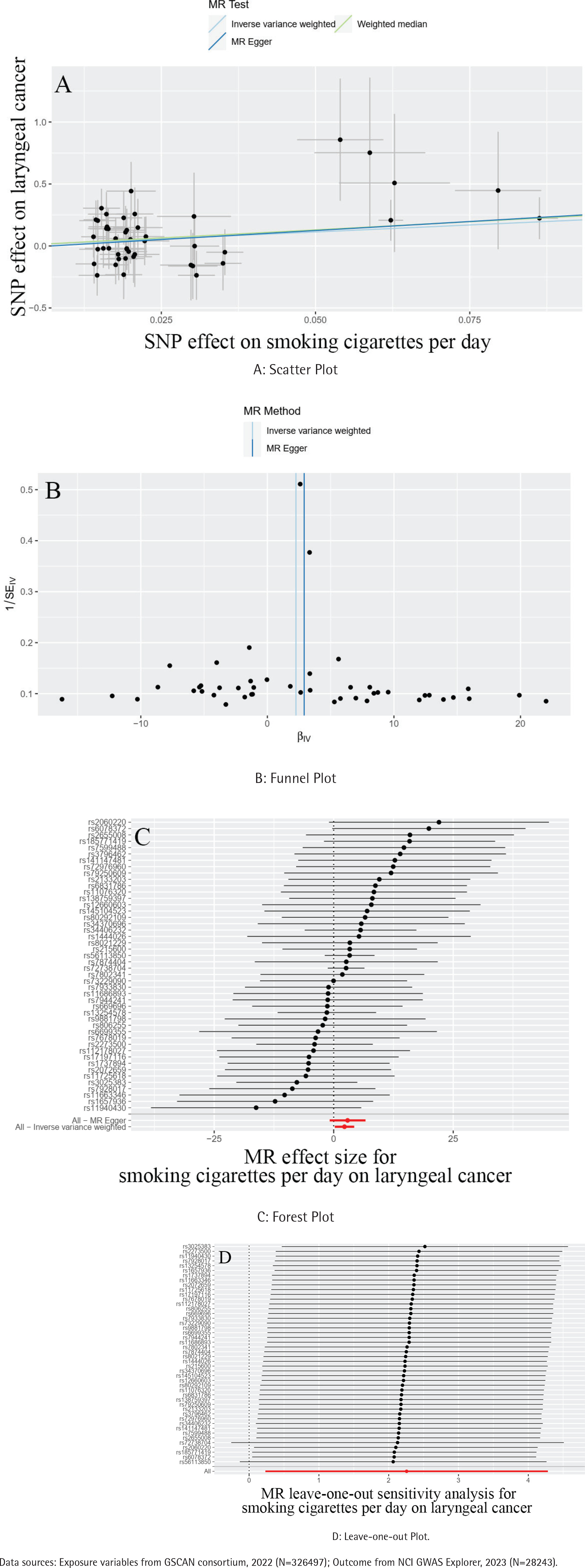 The MR-Egger intercepts showed no evidence of directional pleiotropy (all p>0.05), indicating that the observed associations were not likely due to confounding by pleiotropic effects. The causal estimates obtained through MR-PRESSO analysis remained consistent before and after correction for outliers, supporting the robustness of the MR results (Table 2). Although the heterogeneity test suggested potential variations in outcomes, the Cochran Q test revealed no significant difference among the SNPs related to laryngeal cancer (Table 2). Additional analyses, including scatter, funnel, and forest plots of the relationship between smoking amount and laryngeal cancer development, are provided in Figures 2A–2C. The leave-one-out analysis indicated that no specific genetic variation significantly impacted the overall estimation of causality (Figure 2D).
