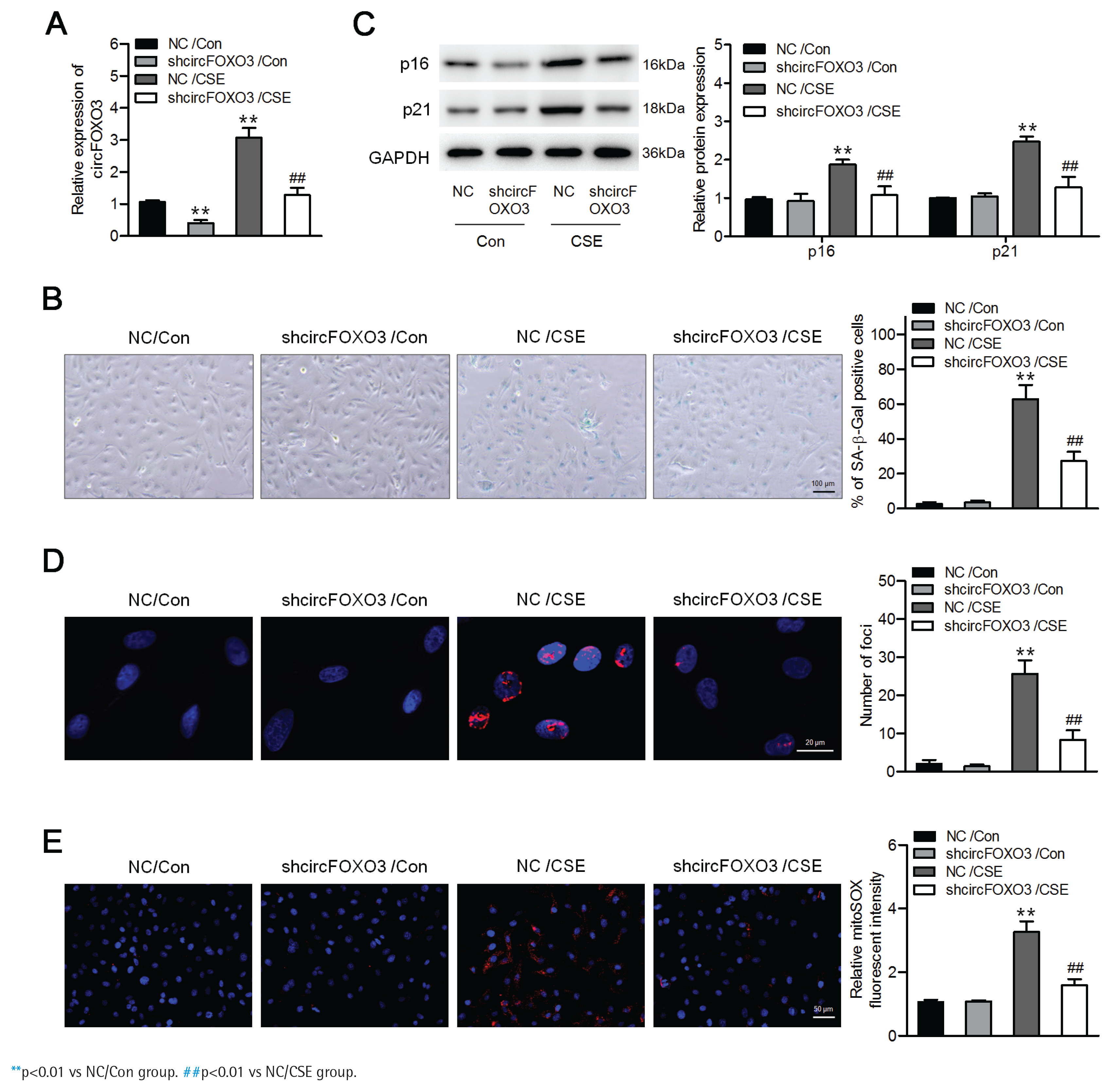 Downregulation of circFOXO3 suppressed CSE-induced senescence in MLE12 cells: A) MLE12 cells were infected with lentivirus carrying circFOXO3 shRNA (shcircFOXO3) or NC, and qPCR was used to determine circFOXO3 levels in these cells treated with or without 2.5% CSE for 24 h (n=3); B) SA-β-gal staining of the indicated cells (n=3); C) Western blotting was used to determine the expression levels of p16 and p21 in cells treated with or without 2.5% CSE (n=3); D) Immunofluorescence microscopy of γH2AX in the indicated cells (n=3); E) MitoSOX™ Red staining (n=3)