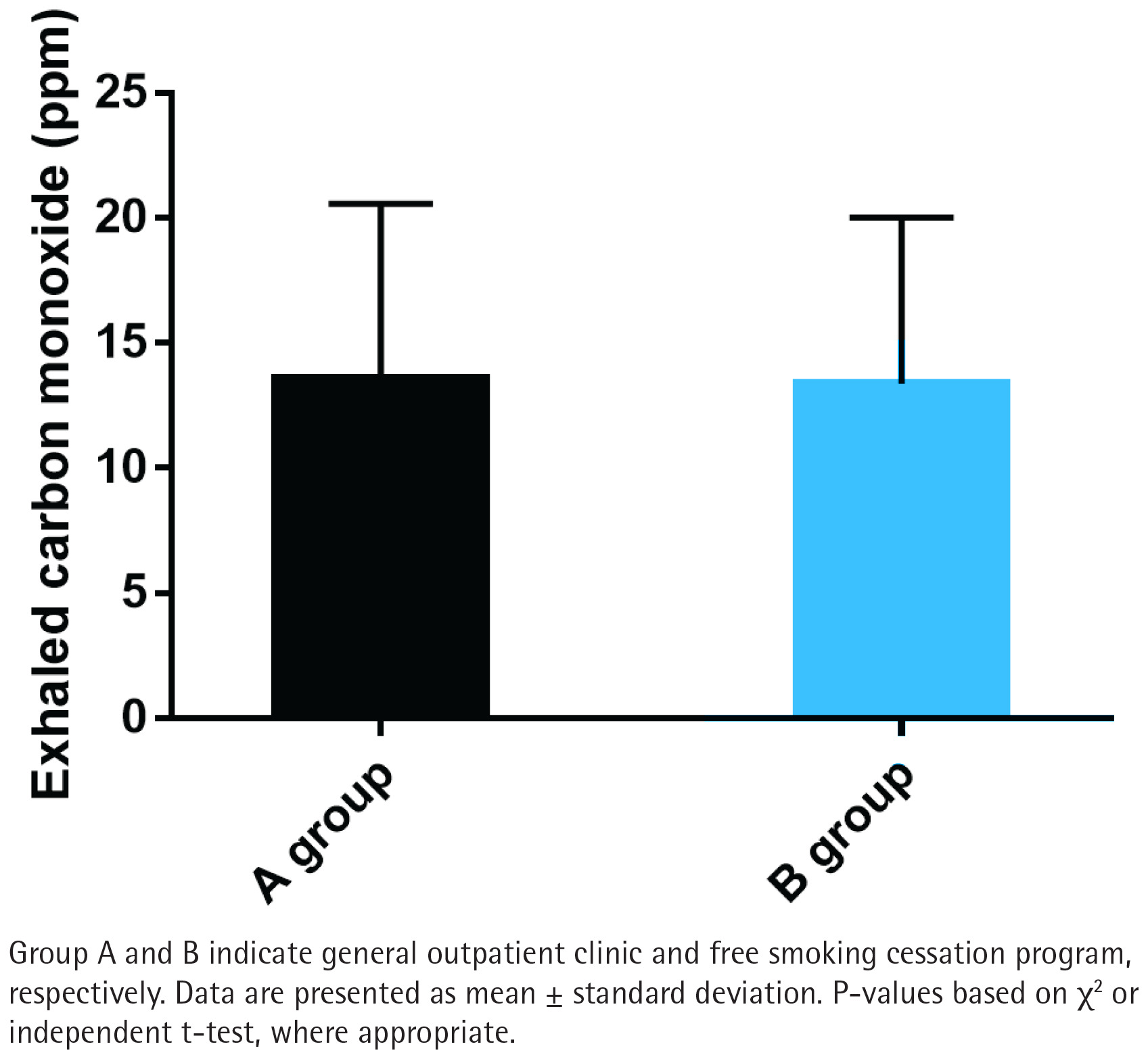 No significant differences were observed in exhaled carbon monoxide (CO) levels between the two groups (p>0.05; Figure 4). The mean exhaled CO level in Group A was 12.4 ± 4.7 ppm, while in Group B it was 11.8 ± 4.2 ppm. This implies that both interventions have comparable effects on reducing biological markers of smoking.
