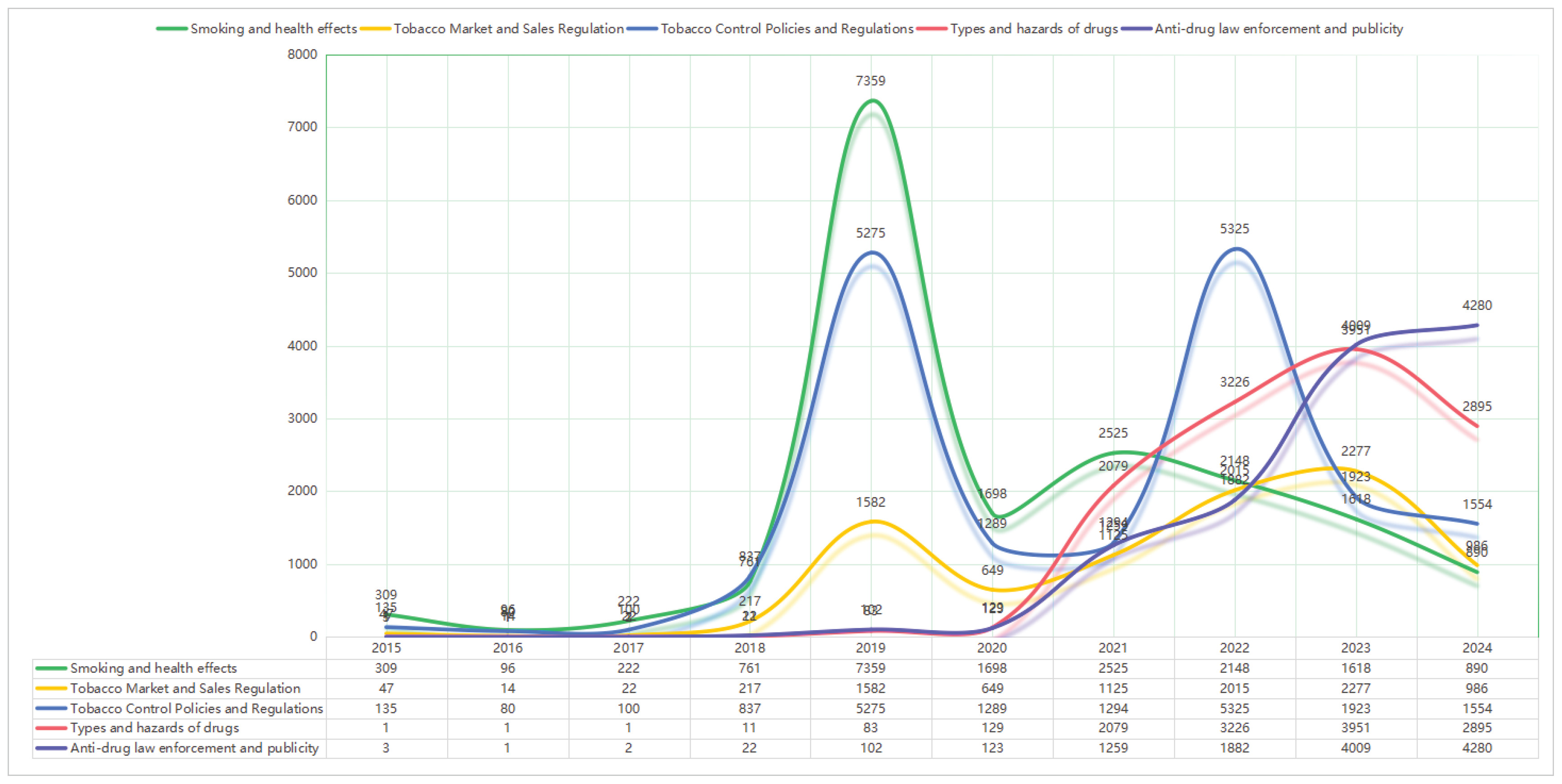 Drugs and anti-narcotics ranked third (n=25148), with a relatively even distribution between anti-drug enforcement and public campaigns (n=13072) and discussions on drug types and harms (n=12076), often linking e-cigarettes to broader drug control narratives.