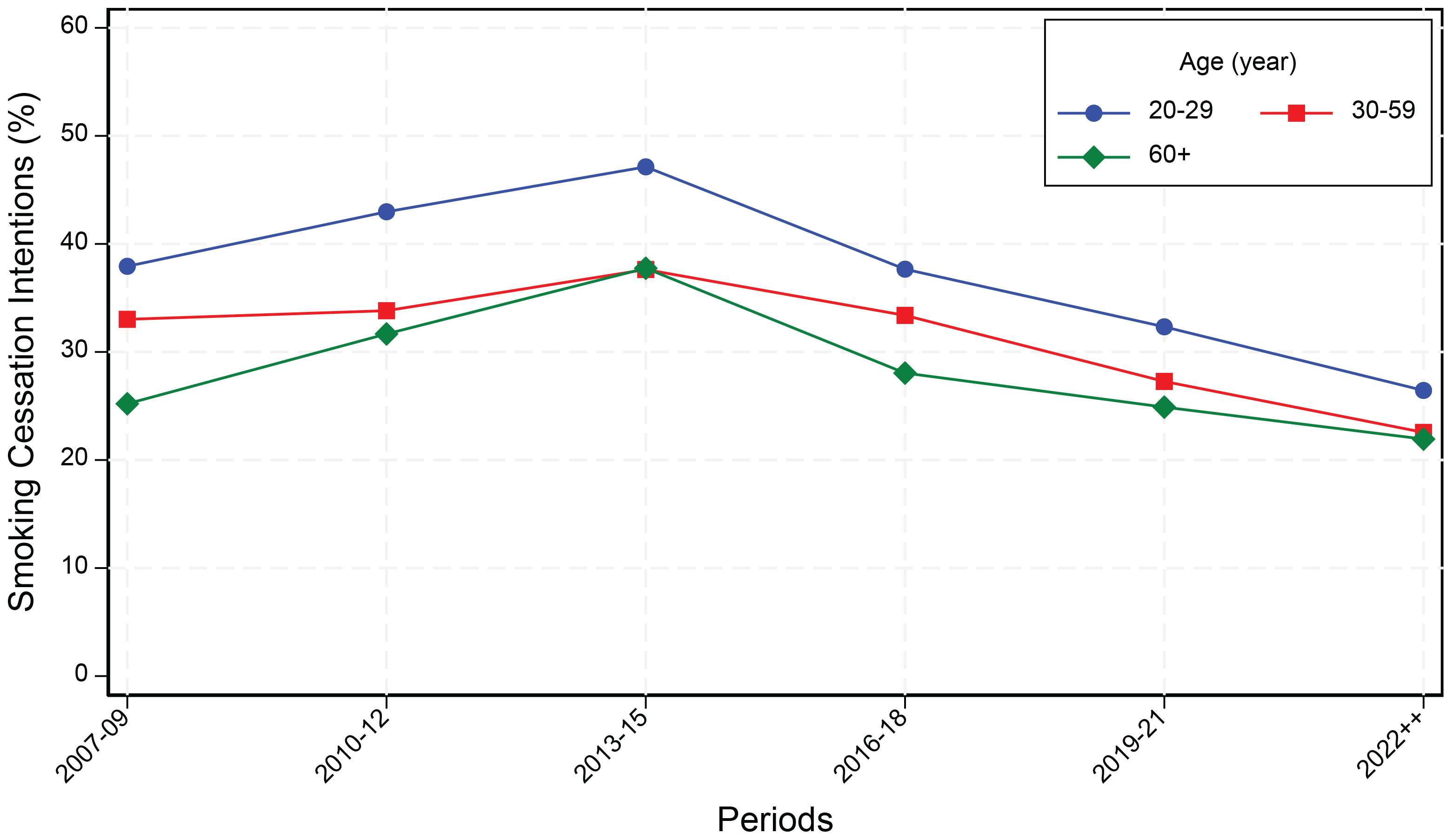 Figure 1 illustrates the trends in smoking cessation intentions across three age groups (20–29, 30–59, and ≥60 years) in six periods from 2007–2009 to 2022 and later. The figure reveals a consistent pattern where younger adults (aged 20–29 years) maintained higher cessation intentions throughout all periods compared to middle-aged (aged 30–59 years) and the elders (aged ≥60 years), with the highest intentions (47%) observed in 2013–2015. All age groups demonstrated a similar trajectory, with cessation intentions increasing from 2007–2009 to peak in 2013–2015, followed by a steady decline through 2022 and later, where intentions reached their lowest levels (22–26%) across all age groups.