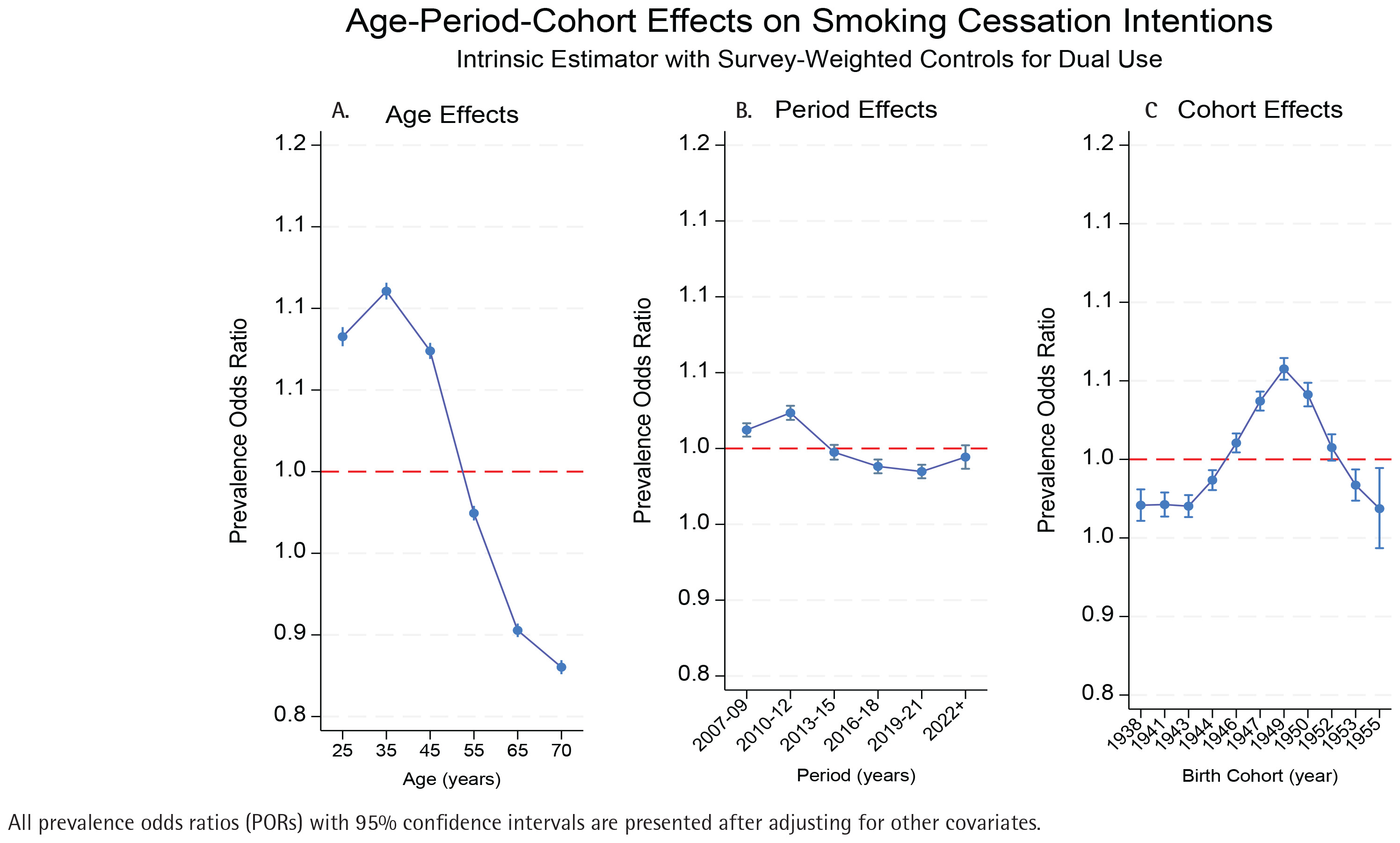 The APC analysis was done using STATA BE version 19.5. The Intrinsic Estimator (IE) was applied to resolve collinearity among age, period, and cohort effects (by decomposing age, period, and cohort effects into independent components), as conventional constraints (e.g. equality constraints) introduce arbitrary biases. It was also recommended to avoid arbitrary assumptions, using orthogonal decomposition to isolate age, period, and cohort effects14. Survey-weighted multinomial logistic regression and logistic regression models were fitted using Stata 19.0’s apc_ie package15. The IE decomposes temporal effects into orthogonal components, ensuring unbiased estimates of age, period, and cohort contributions14. First, the survey-adjusted likelihood ratio test was used for univariable analysis. Then, we reported adjusted prevalence odds ratios (PORs) using multivariable logistic regression to assess associations between dual use and cessation intentions, adjusting for age, period, cohort, and sociodemographic factors. In this analysis, PORs were interpreted as the odds of having cessation intention compared with the those reported no cessation intention, consistent with cross-sectional study design recommendations16. All statistical tests were two-tailed, with a significance level set at α=0.05. For the ordinal logistic regression models, we also assessed the proportional odds assumption using the Brant test, and no violations were detected.