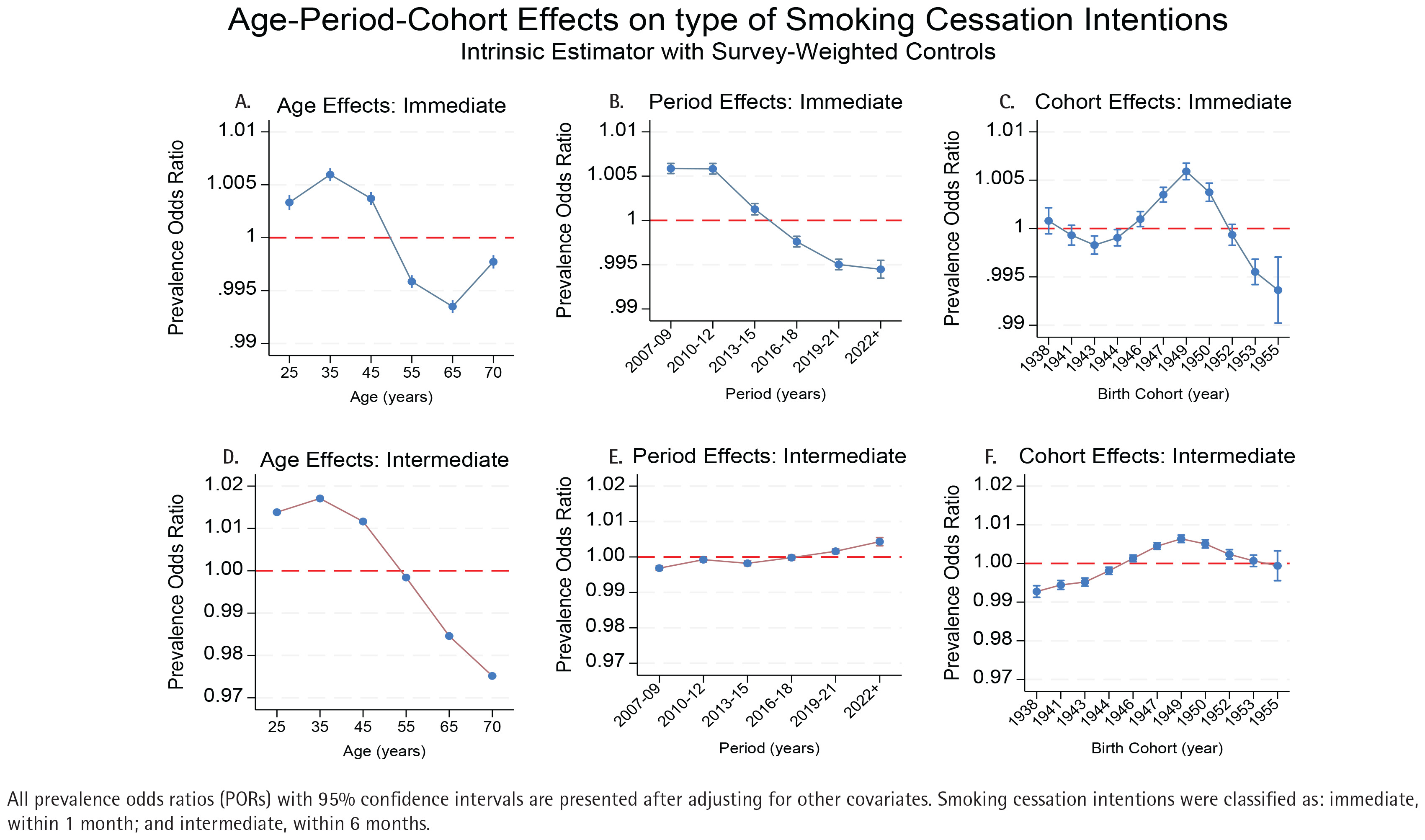 Figures 3A-3F presents the age-period-cohort effects on two distinct cessation intention timeframes: immediate (within 1 month) and intermediate (within 6 months). Immediate quit intentions follow a gentle inverted U-shape, peaking at the age of 35 years (POR=1.006; 95% CI: 1.005–1.007) and varying only 1.3% across ages. In contrast, intermediate intentions rise to a POR=1.017 (95% CI: 1.016–1.018) at the age of 35 years then fall to 0.975 (95% CI: 0.974–0.976) by the age of 70 years, a 4.2% drop. Immediate intentions were strongest in 2007–2012 (POR=1.006 both phases, 95% CI: 1.005–1.007) before declining to 0.995 (95% CI: 0.994–0.996) in 2019–2021, and 0.994 (95% CI: 0.993–0.995) in 2022 and later. Intermediate intentions show the reverse: low odds early (POR=0.997; 95% CI: 0.996–0.998 in 2007–2009) and rising to 1.002 (95% CI: 1.001–1.003) in 2019–2021 and 1.004 (95% CI: 1.003–1.005) after 2022. For immediate intentions, effects are flat for 1938–1944 cohorts, peak at 1949 (POR=1.006; 95% CI: 1.005–1.007), then down to 0.994 (95% CI: 0.993–0.996) by 1955. Intermediate intentions mirror this but with stronger gains in 1947–1952 cohorts. Both measures climax in the 1949–1950 cohorts, while the 1955 cohort shows a substantial drop only for immediate plans. The confidence intervals shown in Supplementary file Table S3 indicate greater precision in estimating age effects compared to cohort effects, particularly for recent cohorts.
