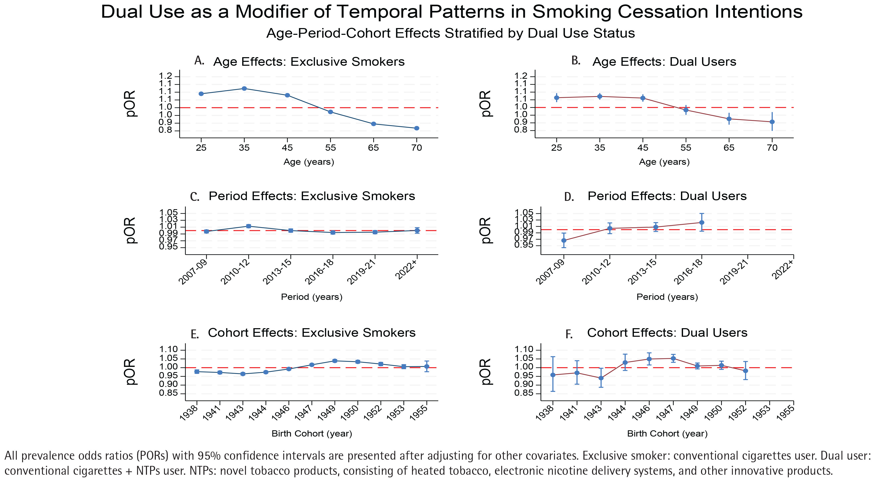 Figures 4A-4F presents the stratified APC effects by tobacco use status, revealing substantial differences in temporal patterns between exclusive smokers and dual users. For age effects, exclusive smokers demonstrated a pronounced inverted U-shaped pattern, with cessation intentions peaking at the age of 35 years (POR=1.124; 95% CI: 1.119–1.129) before declining steadily to a minimum at the age of 70 years (POR=0.868; 95% CI: 0.863–0.872). This represents a 25.6% reduction in cessation odds across the life course. In contrast, dual users exhibited a flatter age trajectory through middle age (25–45 years), maintaining relatively consistent prevalence odds ratios (POR range: 1.061–1.072), with a more modest decline at the age of 70 years (POR=0.907; 95% CI: 0.848–0.970). In particular, the age-related decline in cessation intentions was significantly attenuated among dual users compared to exclusive smokers (15.4% vs 25.6% reduction from peak to minimum).