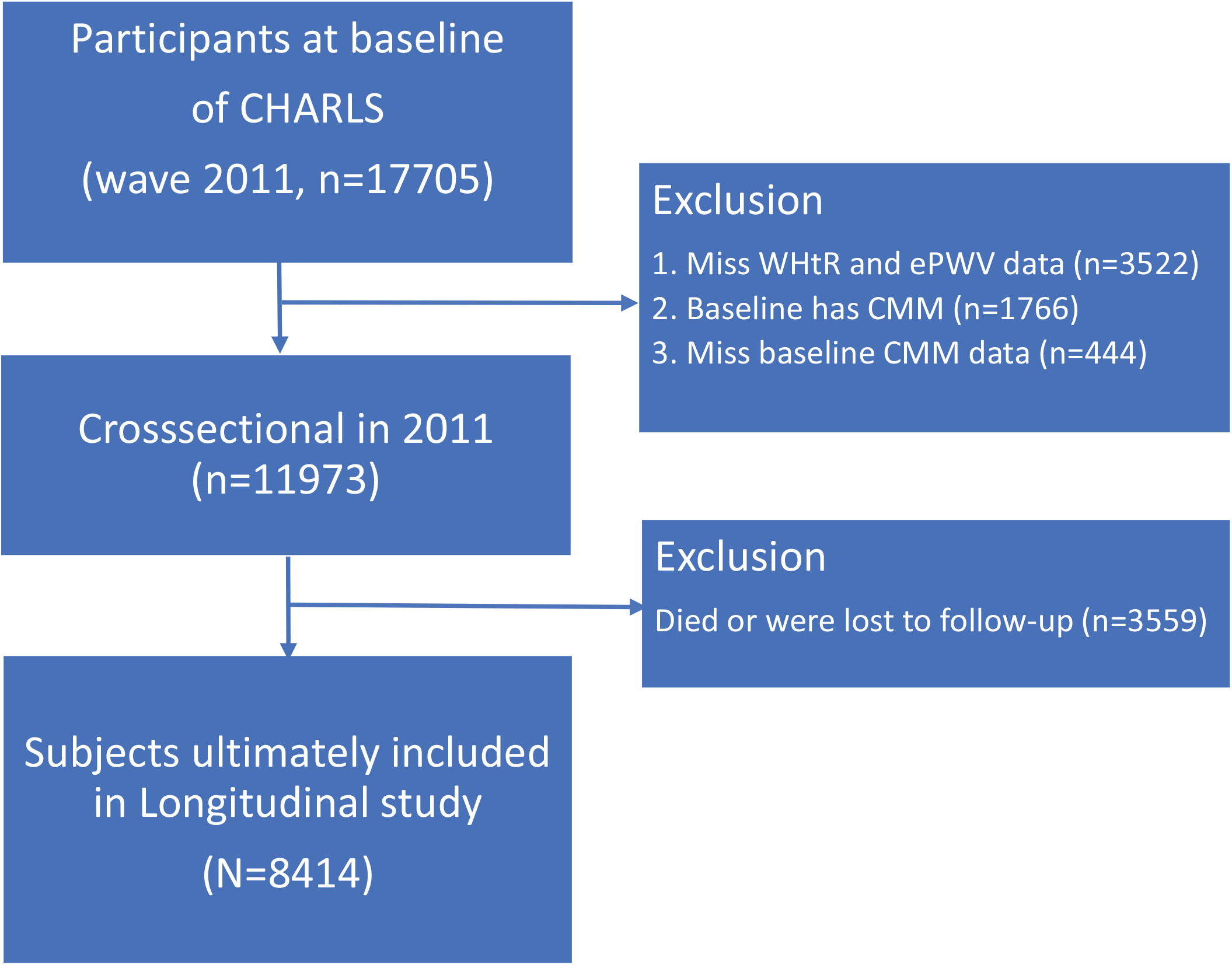 This study used a unique ID to track participants. Starting with 17705 participants at the 2011 baseline, we excluded 9291 participants for the following reasons: CMM presence at baseline (n=1766), missing CMM data (n=444), missing WHtR and ePWV data (n=3522), and missing follow-up data (n=3559). Ultimately, 8414 participants were included in this study (Figure 1).