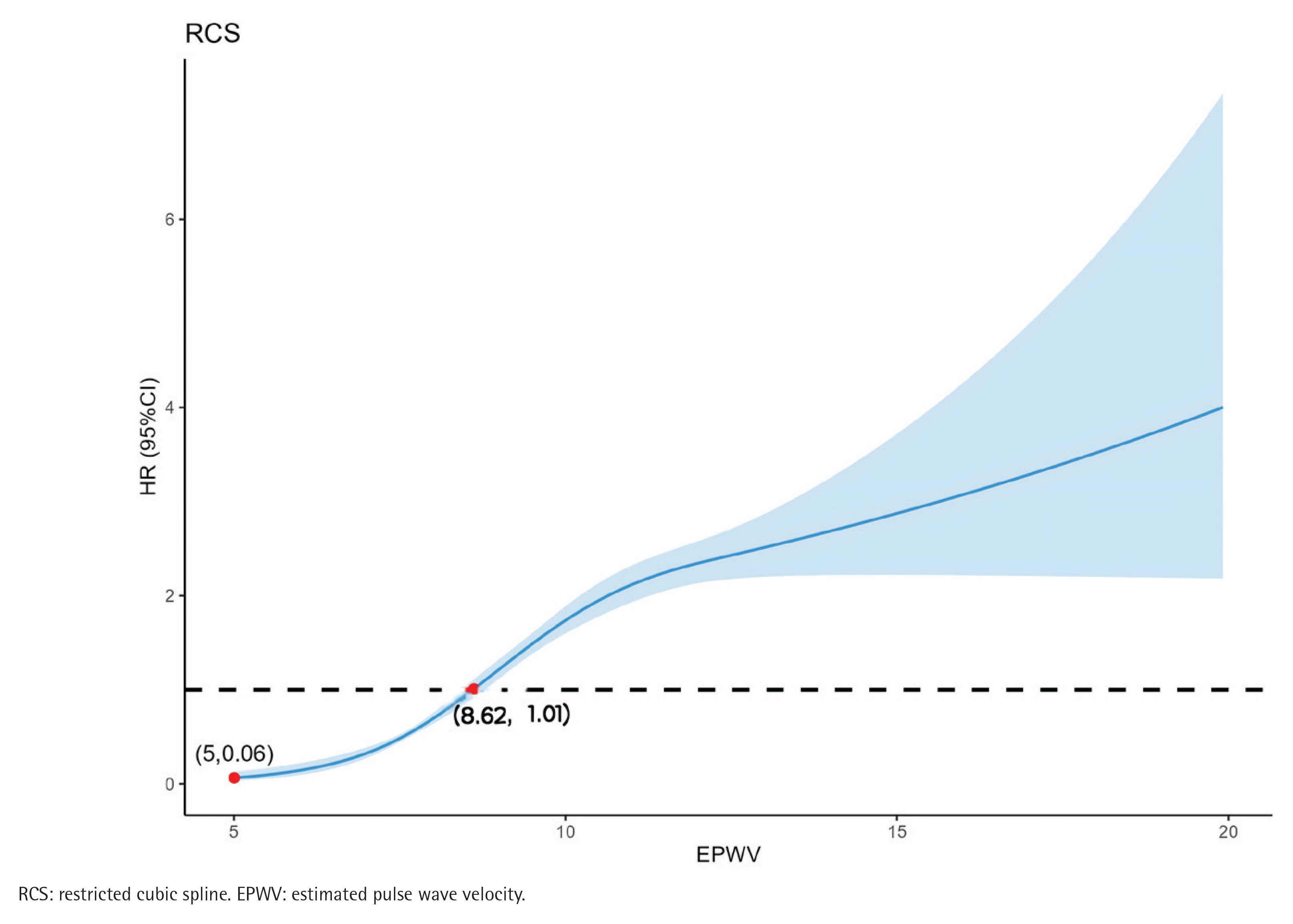 Additionally, the RCS model exhibited a non-linear relationship between ePWV and CMM incidence among all participants (non-linear p<0.001) (Figure 2). As ePWV increased, the HR for CMM gradually increased. The dose–response relationship between ePWV and CMM was consistent with the logistic model.