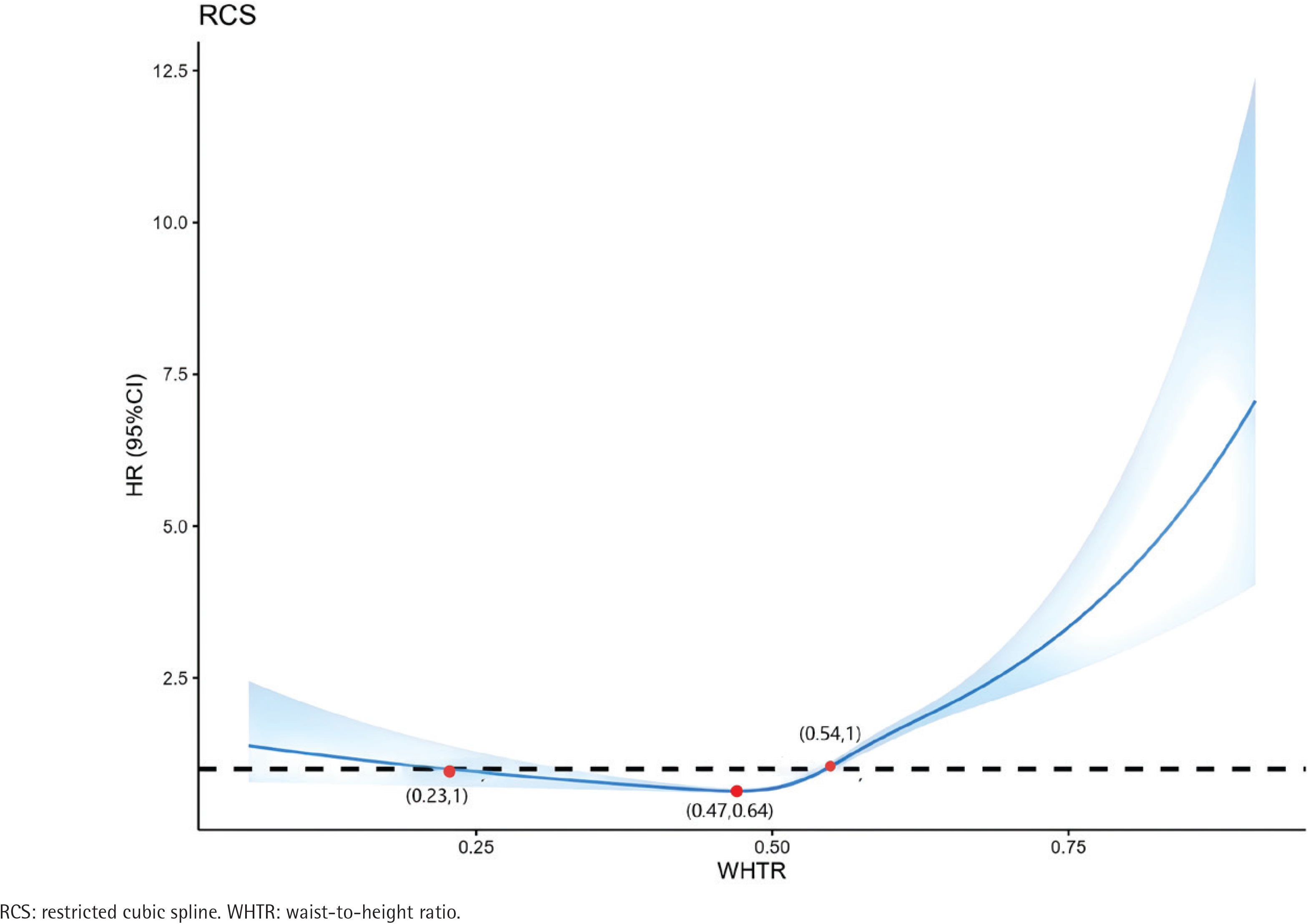 The RCS model exhibited a non-linear relationship between WHtR and CMM incidence among all participants (non-linear p<0.001). WHtR and CMM incidence exhibited a U-shaped relationship. When WHtR was >0.47, WHtR positively correlated with CMM incidence, and when WHtR was >0.54, HR was >1 (Figure 3).