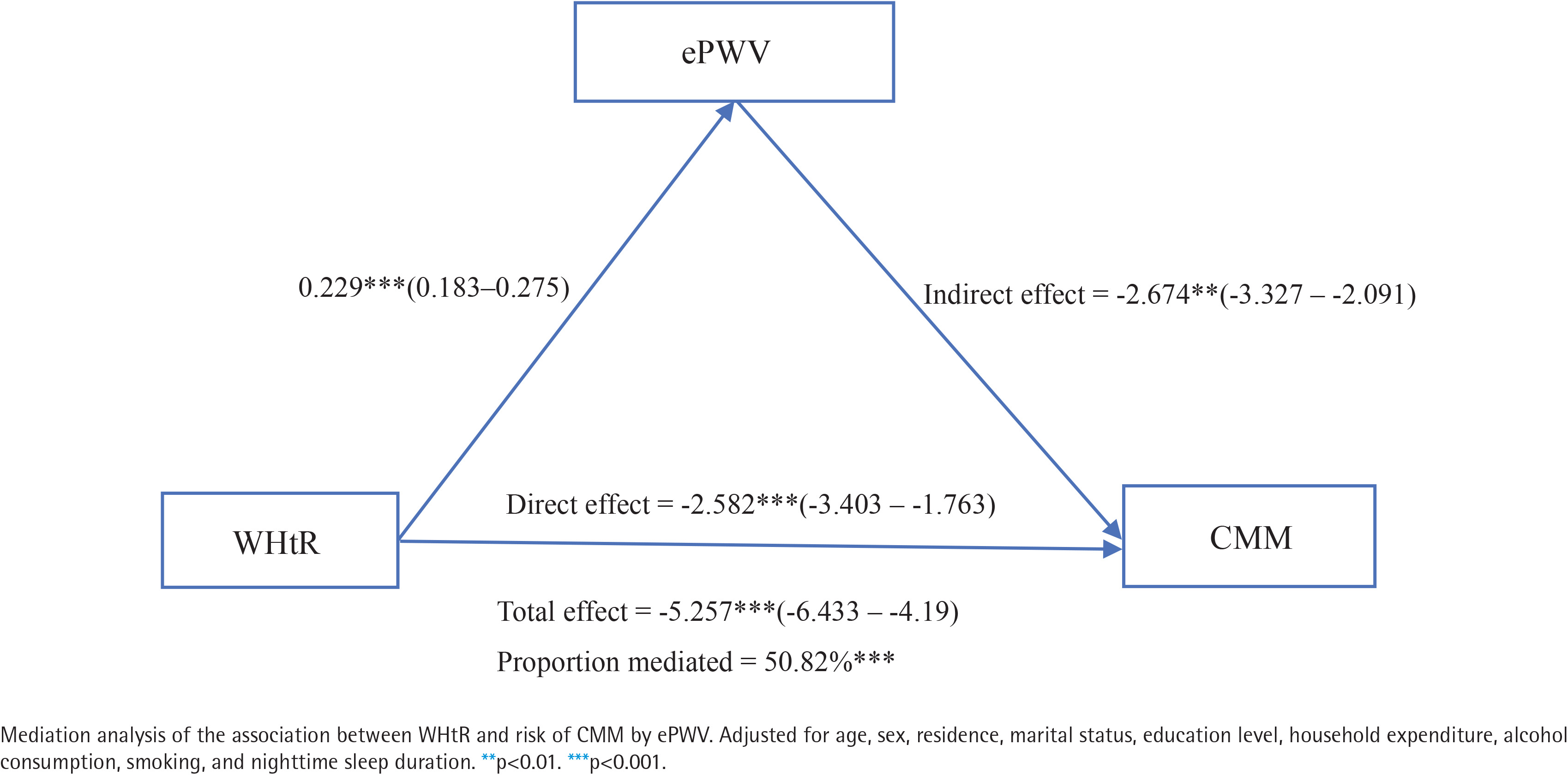 Our findings indicate that ePWV significantly mediates the association between WHtR and new-onset CMM, and that both increased ePWV and WHtR are significantly linked with an increased risk of developing CMM. Early identification and intervention of ePWV and WHtR may be useful for CMM prevention and treatment.