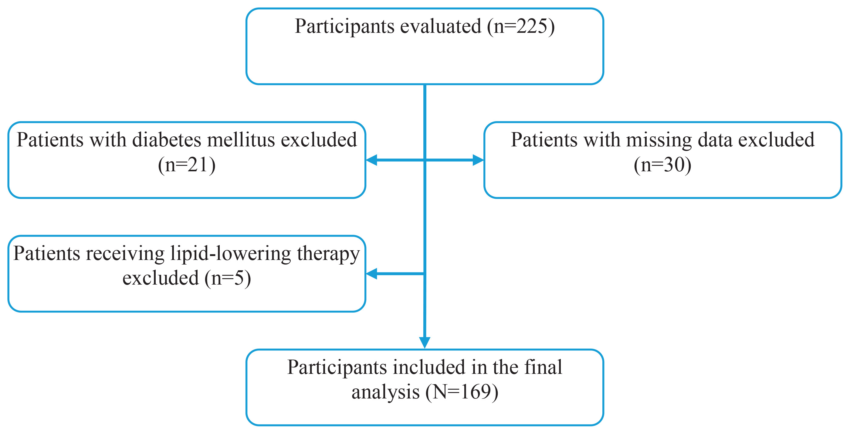 Participants aged 18–80 years who volunteered to participate and reported exclusive combustible cigarette use were included in the study. Individuals using other nicotine products, including e-cigarettes, heated tobacco products, nicotine pouches, or smokeless tobacco, were excluded. Additional exclusion criteria included a diagnosis of diabetes mellitus (n=21), current use of lipid-lowering therapy (n=5), and missing baseline data (n=30). As a result, 56 individuals were excluded, and 169 participants were included in the final analyses. The participant selection process is illustrated in Figure 1.