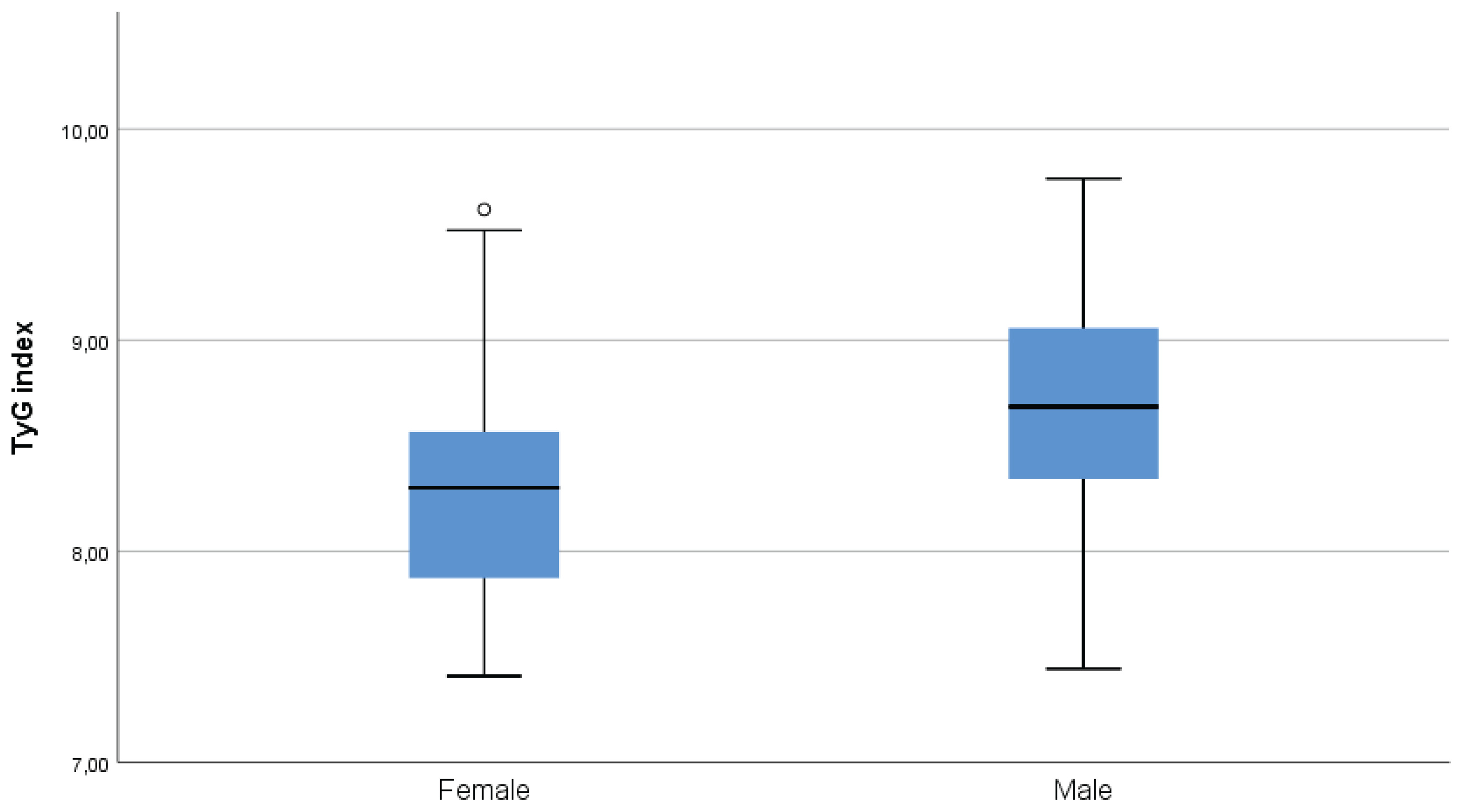 In the present study, the TyG index was higher in males than in females, indicating a sex-related difference in insulin resistance. Similar findings have been reported by Jeong et al.17 who observed higher TyG levels in men. This difference may reflect underlying biological and behavioral factors, including hormonal influences and sex-specific patterns of visceral adiposity, as suggested in previous studies5.