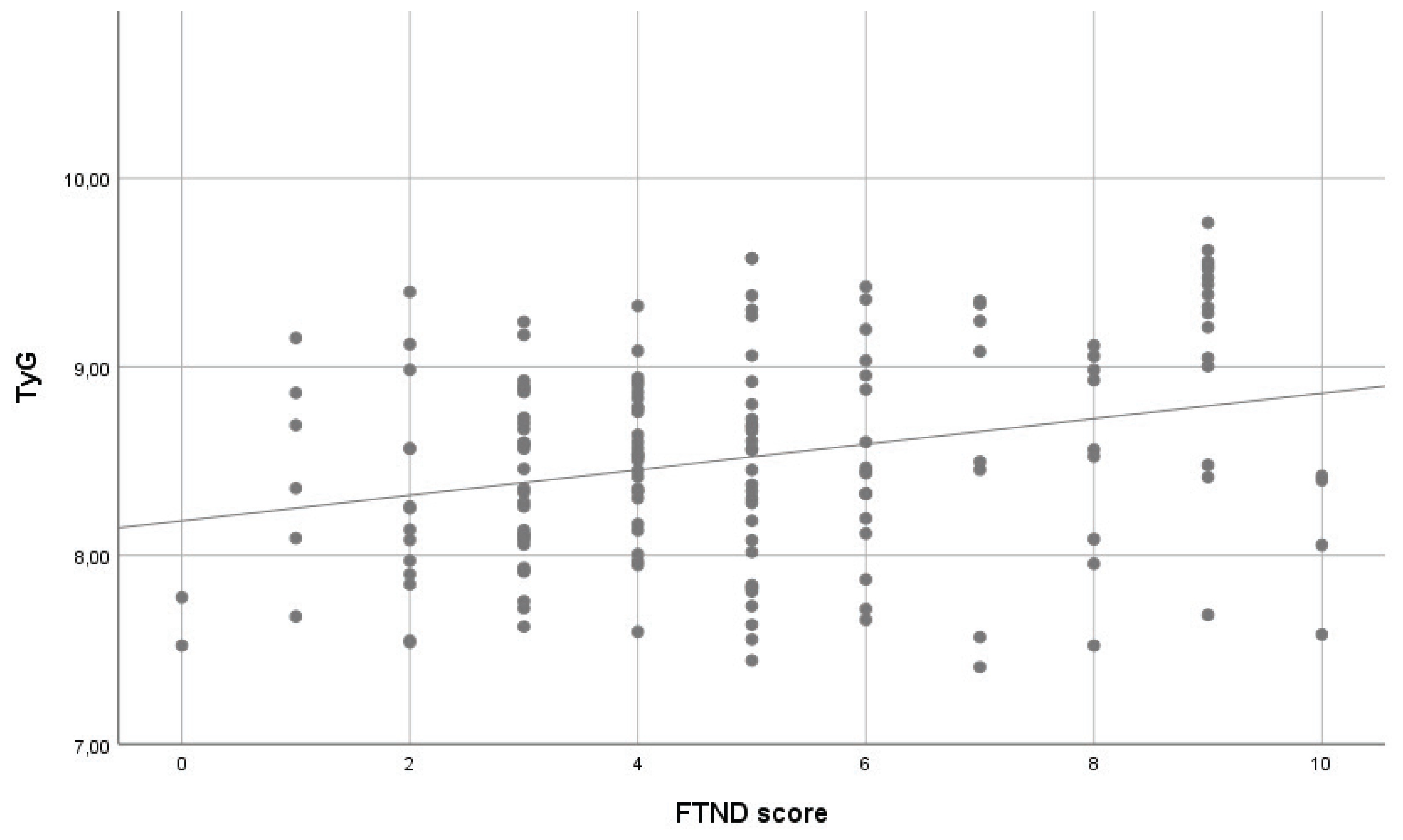 In multivariable linear regression analysis with the TyG index as the dependent variable, higher FTND scores were independently associated with higher TyG levels. In Model 1, which included FTND score only, a significant association was observed between FTND score and the TyG index (β=0.068, SE=0.018; p<0.001). In Model 2, after adjustment for age, sex, and pack-years, FTND score remained significantly associated with the TyG index (β=0.067, SE=0.017; p<0.001). Age (β=0.011, SE=0.004; p=0.002) and male sex (β=0.354, SE=0.078; p<0.001) were also significantly associated with higher TyG levels, whereas pack-years showed no significant association (p=0.703). No evidence of multicollinearity was observed (all VIF values <5) (Table 3). The association between FTND score and the TyG index is shown in Figure 3.