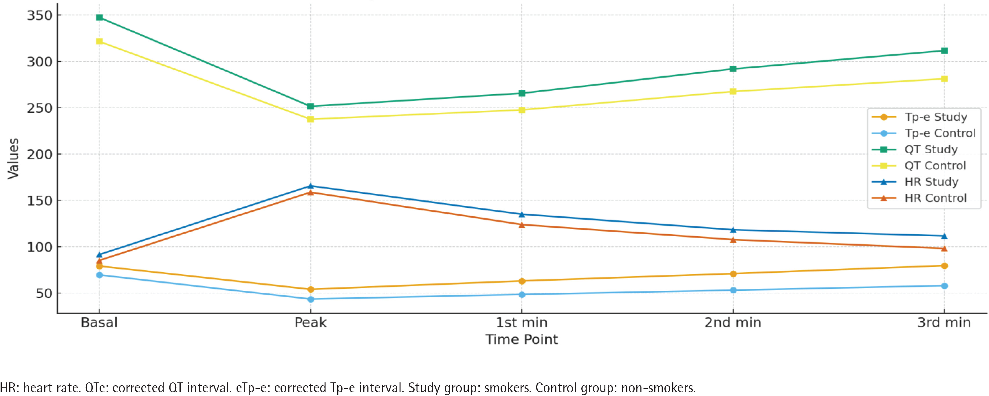 Comprehensive demographic and clinical data were systematically collected for all participants, including age, sex, and body mass index (BMI). Height and weight were measured using standardized procedures with a calibrated stadiometer and scale, and BMI was subsequently calculated as weight in kilograms divided by height in meters squared (kg/m2). Smoking status was assessed via structured self-report questionnaires, capturing both the daily number of cigarettes and the cumulative duration of smoking, to ensure accurate classification of participants as smokers or non-smokers. Electrocardiographic parameters, including Tp-e interval, QT interval, corrected QT (QTc), heart rate (HR), corrected Tp-e (cTp-e), and their respective ratios (Tp-e/QT, Tp-e/QTc), were obtained from standard 12-lead ECG recordings at baseline, at peak exercise during the treadmill exercise test (TET), and at the 1st, 2nd, and 3rd minutes of post-exercise recovery. Measurement procedures were standardized across all participants to minimize intra- and inter-observer variability. Potential confounding variables, including age, sex, and BMI, were identified a priori and considered for adjustment in multivariable regression models to rigorously evaluate their potential influence on the observed electrocardiographic outcomes, thereby enhancing the robustness and interpretability of the study findings.