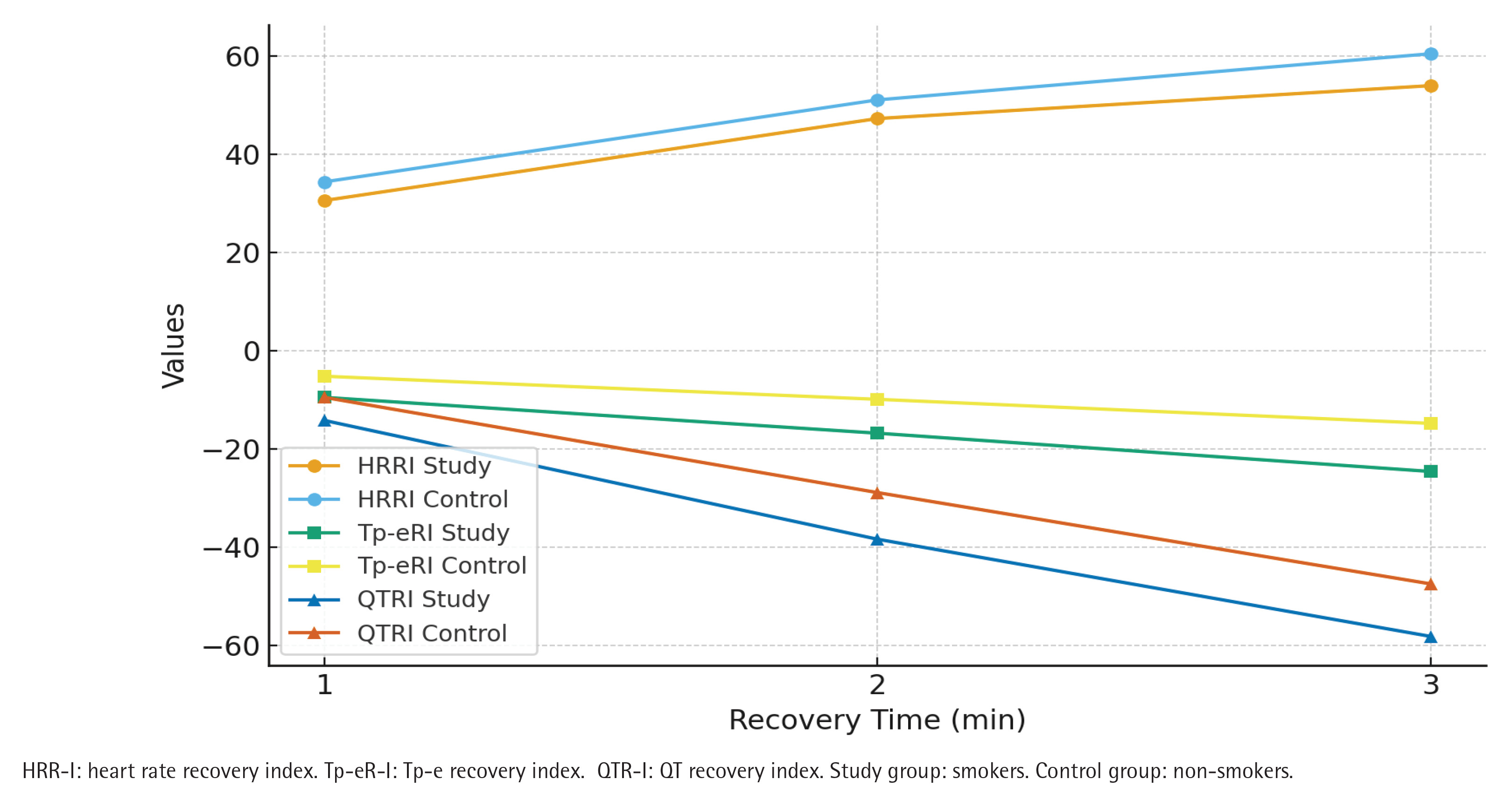 However, data on the relationship between recovery indices of QT and Tp-e intervals (QTR-I and Tp-eR-I) and HRR-I in smokers are limited. Therefore, the present study aimed to investigate the interactions between HRR-I, QTR-I, and Tp-eR-I parameters in smokers and to explore their potential role in predicting the risk of malignant ventricular arrhythmia.