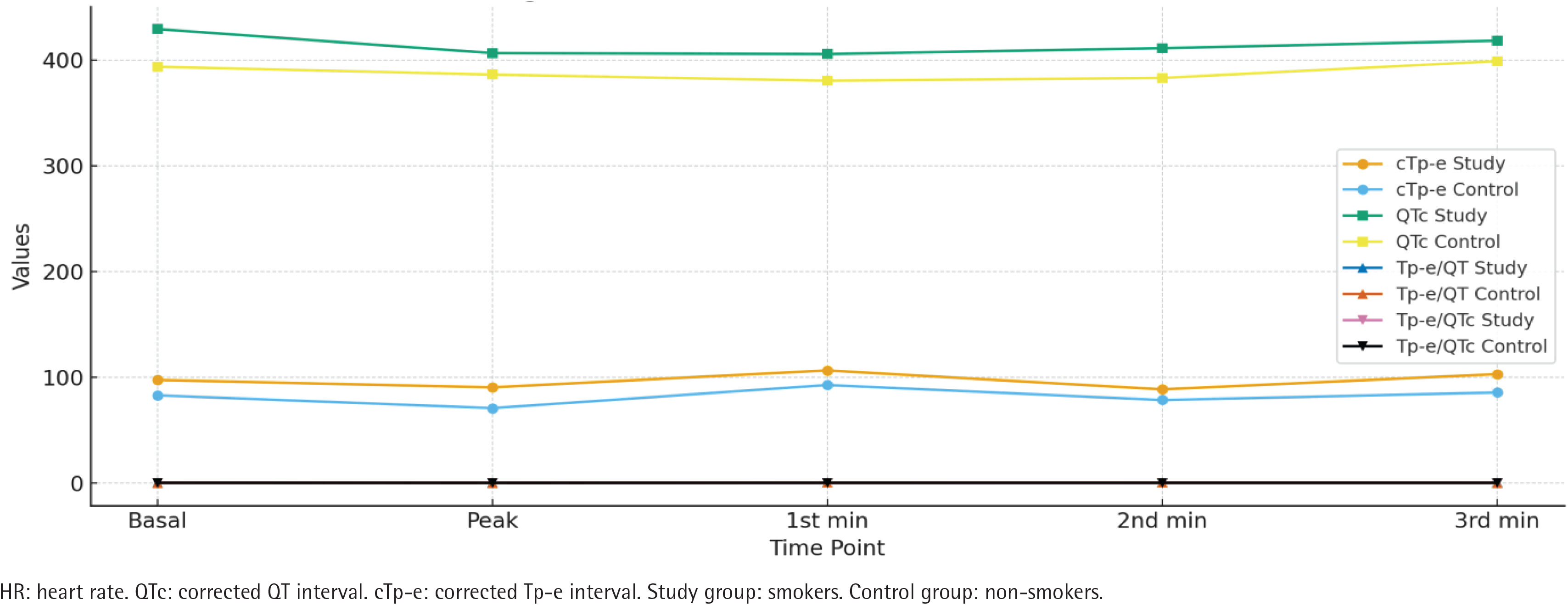 Regarding corrected values and ratios, the smokers group demonstrated significantly higher basal cTp-e, QTc, Tp-e/QT, and Tp-e/QTc values compared to the non-smokers group. Similarly, peak, 1st, 2nd, and 3rd minute corrected Tp-e, QTc, Tp-e/QT, and Tp-e/QTc values were all significantly higher in the smokers group (all p<0.01) (Table 3, Figure 1).
