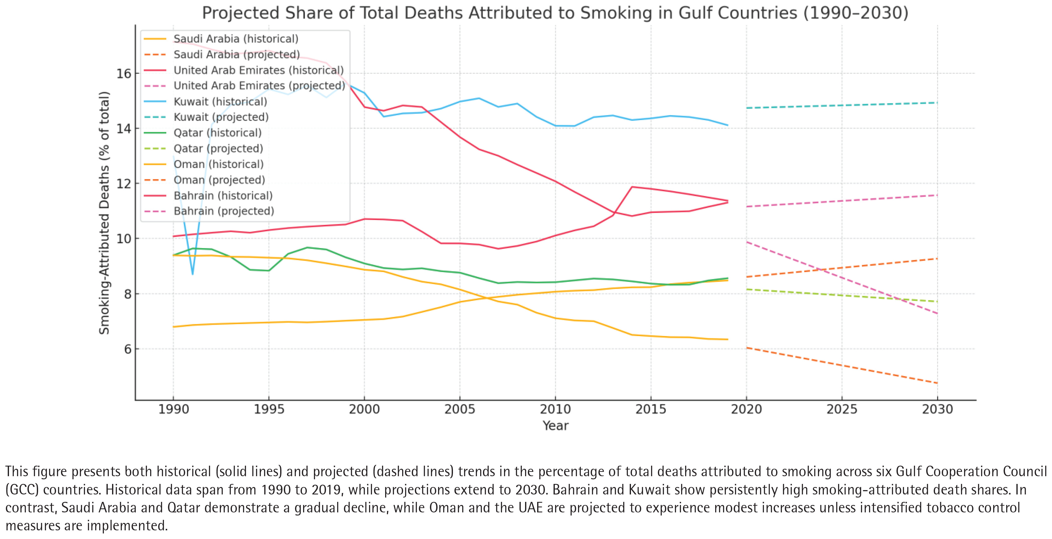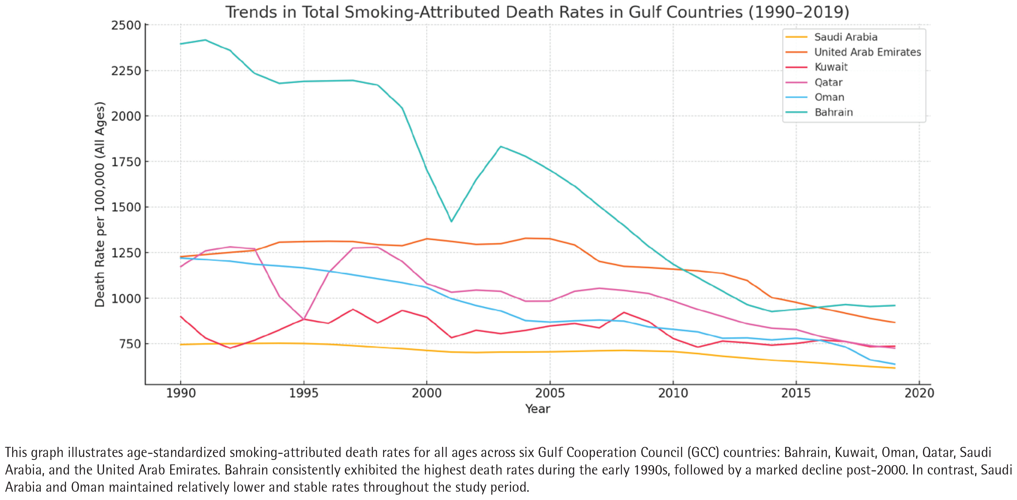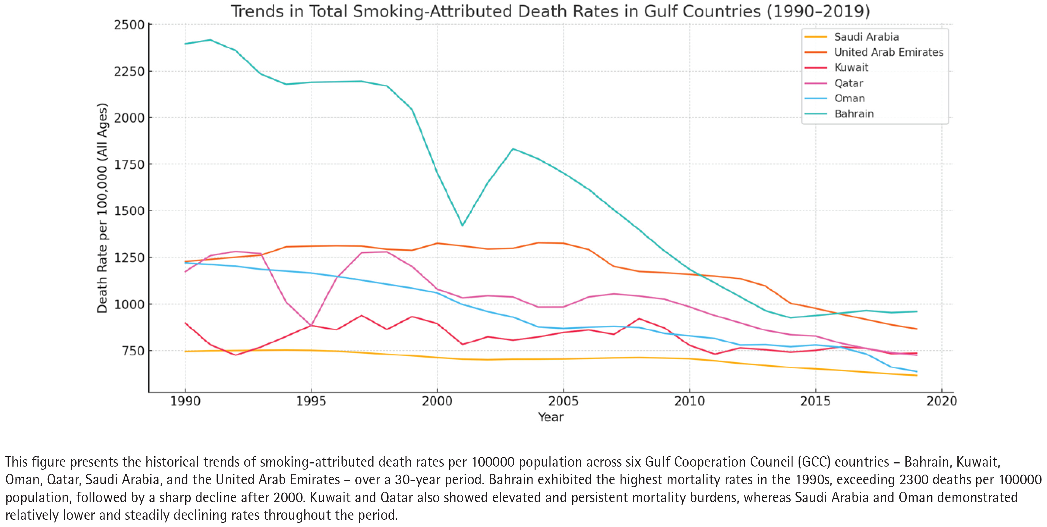 This systematic analysis of smoking-attributed mortality in the Gulf region over three decades provides valuable insight into the temporal, age-specific, and inter-country variation in tobacco-related health outcomes. The findings highlight both progress and ongoing challenges in reducing the burden of disease due to smoking, with substantial implications for public health strategy, healthcare resource allocation, and long-term policy planning.
