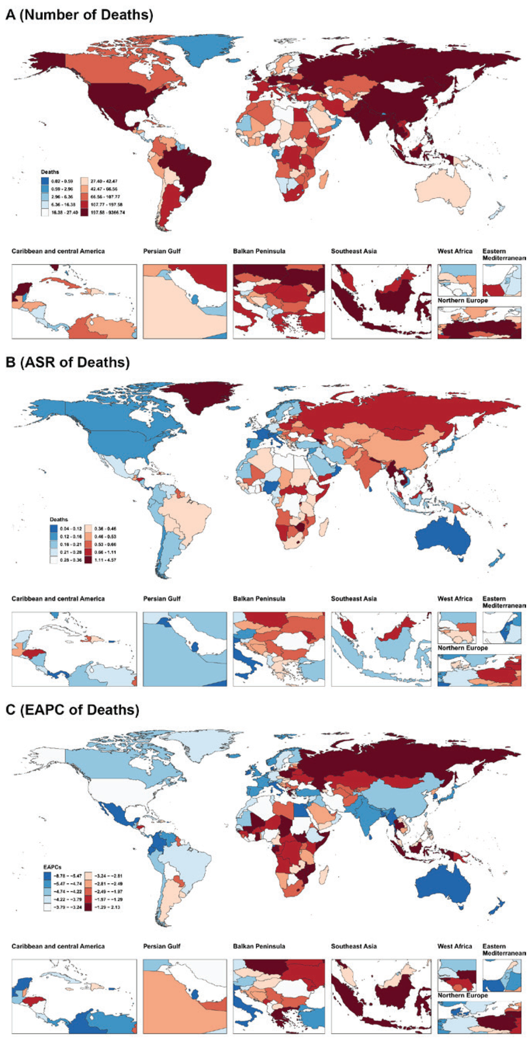 The numbers of deaths, along with ASR, for tobacco-attributable digestive diseases in 2021, and EAPC, from 1990 to 2021 across 204 countries and territories globally are shown in Figure 1.