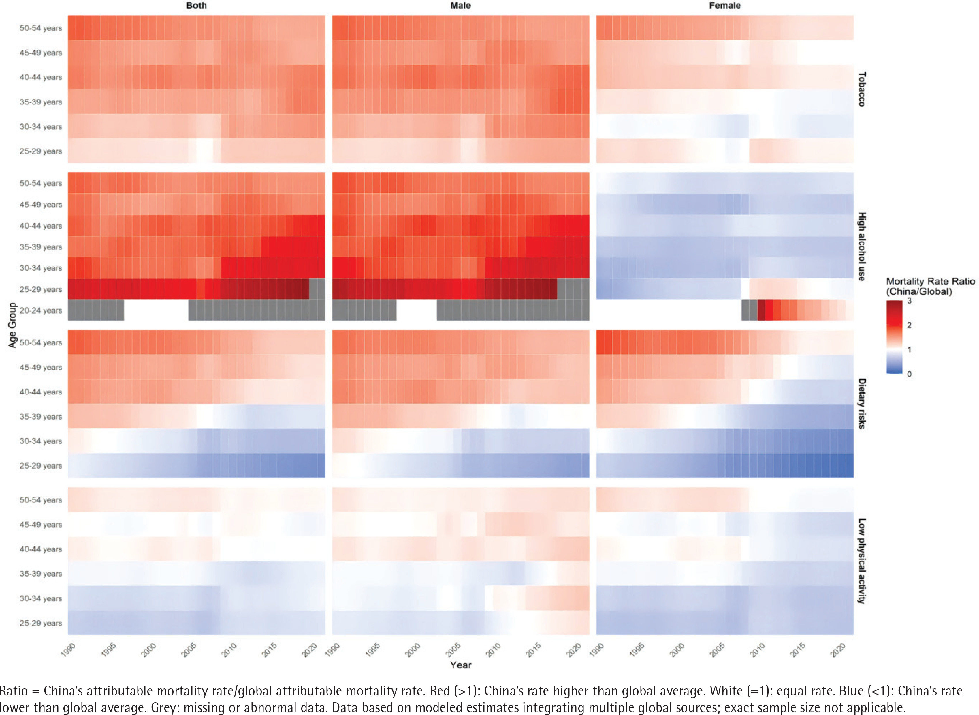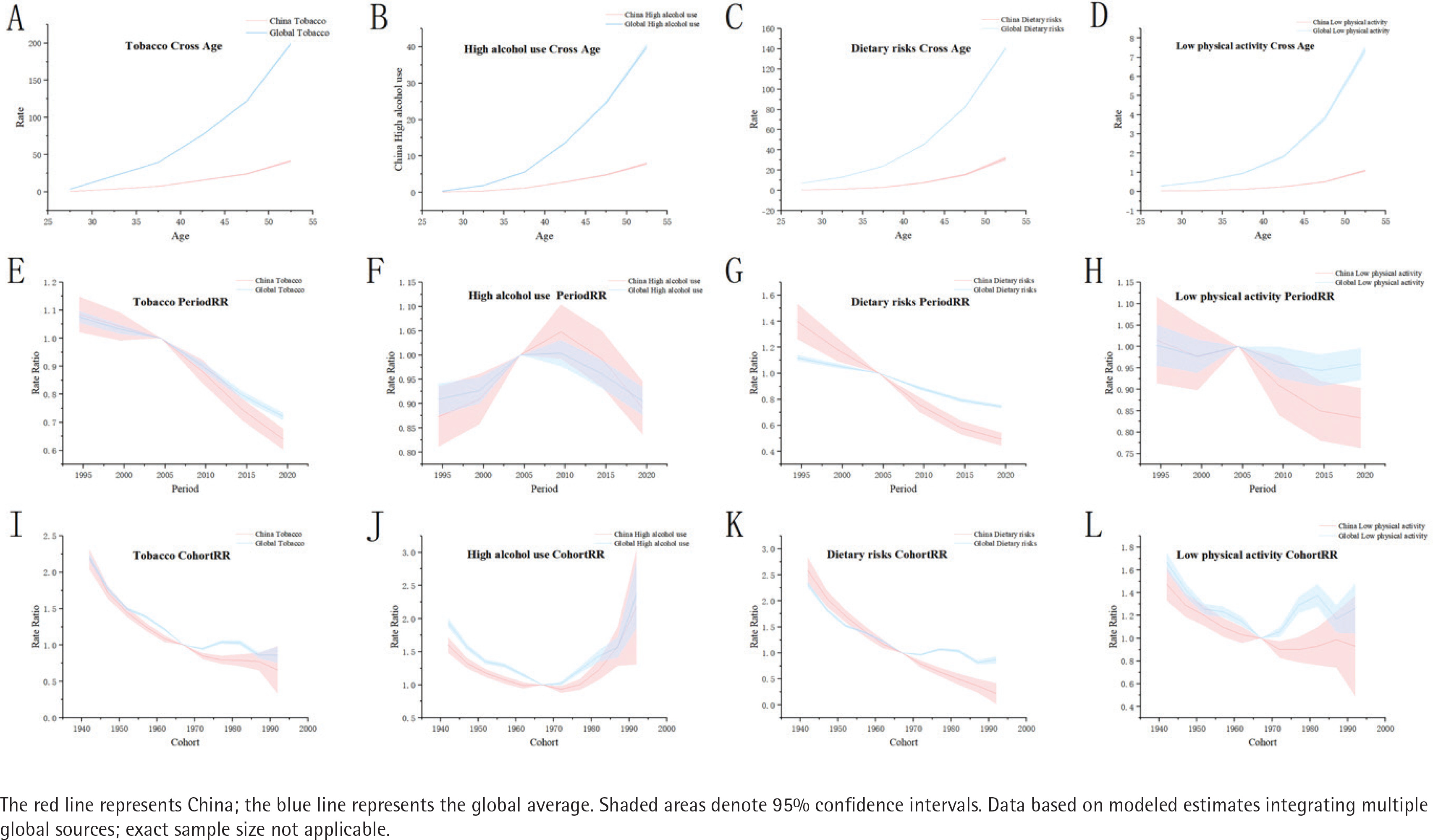 Supplementary file Figure 2 compares APC analyses of DALYs attributable to tobacco, alcohol, dietary risks, and low physical activity between China and global trends for individuals aged 25–54 years during 1992–2021. For tobacco (Panels A, E and I), global age-specific rates rose sharply after the age of 40 years, whereas period trends in China declined more rapidly. Cohort risk was elevated in earlier generations but markedly decreased in more recent cohorts. With respect to alcohol (Panels B, F and J), the age trends in China were milder than the global patterns. The period effects were similar between China and the global average, but cohort risk increased in recent generations, indicating generational shifts. For dietary risk (Panels C, G and K), the global age trajectories became steeper, while Chinese period trends demonstrated faster declines. Historical Chinese cohorts presented greater risks, with improvements observed in more recent generations. Finally, for low physical activity (Panels D, H and L), global age-related increases were most notable after the age of 40 years. Period trends have declined modestly since 2000, with cohort risk being highest among older Chinese generations.
