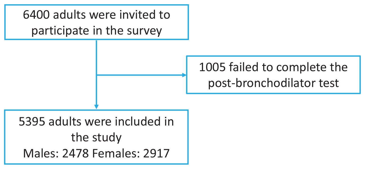 The study was conducted from June 2012 to May 2015. We employed simple random sampling to select participants from the research area. In Guizhou Province, we evaluated 6400 individuals. Of these, 5395 adults aged ≥20 years who had resided at their current address for a minimum of six months prior to the survey, were invited to take part (Figure 1). We excluded people who could not be interviewed or who declined to give informed consent. Additionally, we excluded individuals that were ineligible for spirometry due to various conditions: 1) chest, abdominal, or eye surgery; 2) retinal detachment; 3) a myocardial infarction within the last three months; 4) hospitalization for cardiac issues in the preceding month; and 5) pregnancy or breastfeeding. This study protocol received approval from the Ethics Review Committee of Guizhou Provincial People’s Hospital. We obtained written informed consent from all participants.