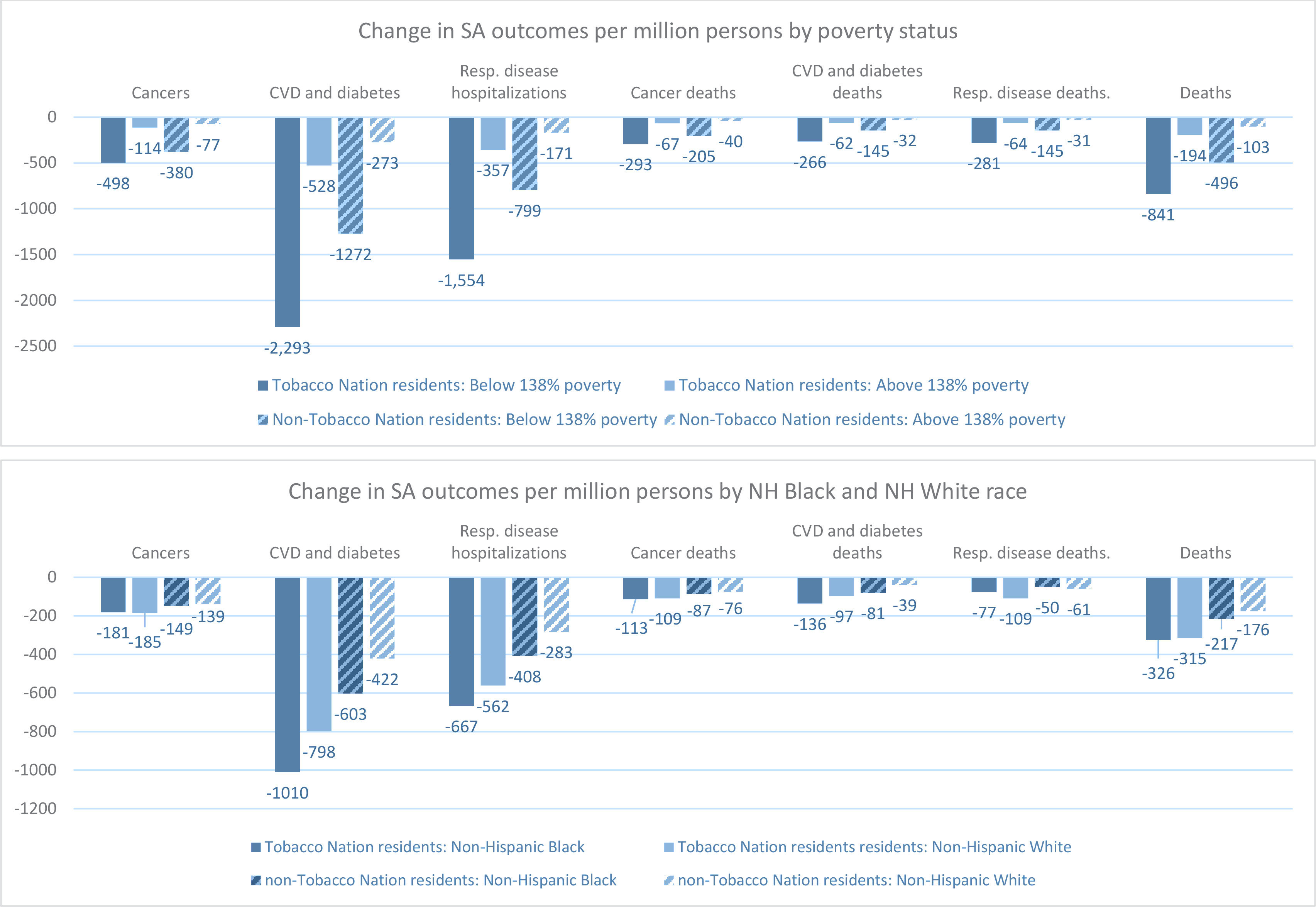 a Results reflect the initial simulated model population of 1 million in 2021. The population size changes each year in the model. Population groups are age-adjusted to match the overall age distribution of each state. The Tobacco Nation average is the average of each state weighted by state adult population. The Non-Tobacco Nation average is computed from the United States average, the Tobacco Nation average and the total population of Tobacco Nation as proportion of the US population. SA: smoking-attributable. NH: Non-Hispanic.