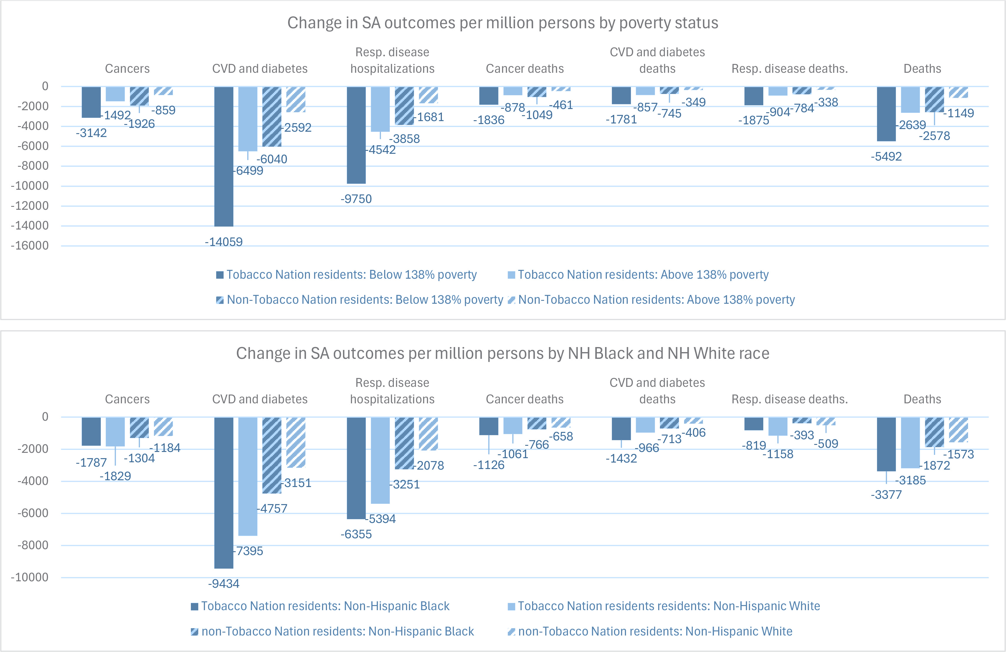 Figure 2 and Table 4 present age-adjusted results for simulation models projecting the impact of simultaneously increasing the cigarette tax by $1.50 per pack and increasing state-level TCE to the CDC-recommended level, compared to a scenario in which cigarette taxes and TCE remain static. Compared to the tax-only scenario, the combined policies would lead to substantially greater reductions in all SA outcomes for all population subgroups examined. Compared to a static policy scenario, the combined policies would reduce SA deaths by 5492 among Tobacco Nation residents with incomes below 138% the FPL, 2639 among residents with incomes above 138% the FPL, 3185 among NH White residents, and 3377 among NH Black residents, per million persons (Figure 2). Similar to the tax-only scenario, Table 4 indicates reductions in SA health outcomes were projected to be greatest among Tobacco Nation residents below 138% the FPL compared with those above 138% the FPL (about 2.1 times greater). Also similar to the tax-only scenario, Table 4 indicates the combined policies would have a greater impact on smoking among NH White individuals than NH Black individuals, but a greater impact on some SA health outcomes for non-Hispanic Black individuals than for non-Hispanic White individuals.