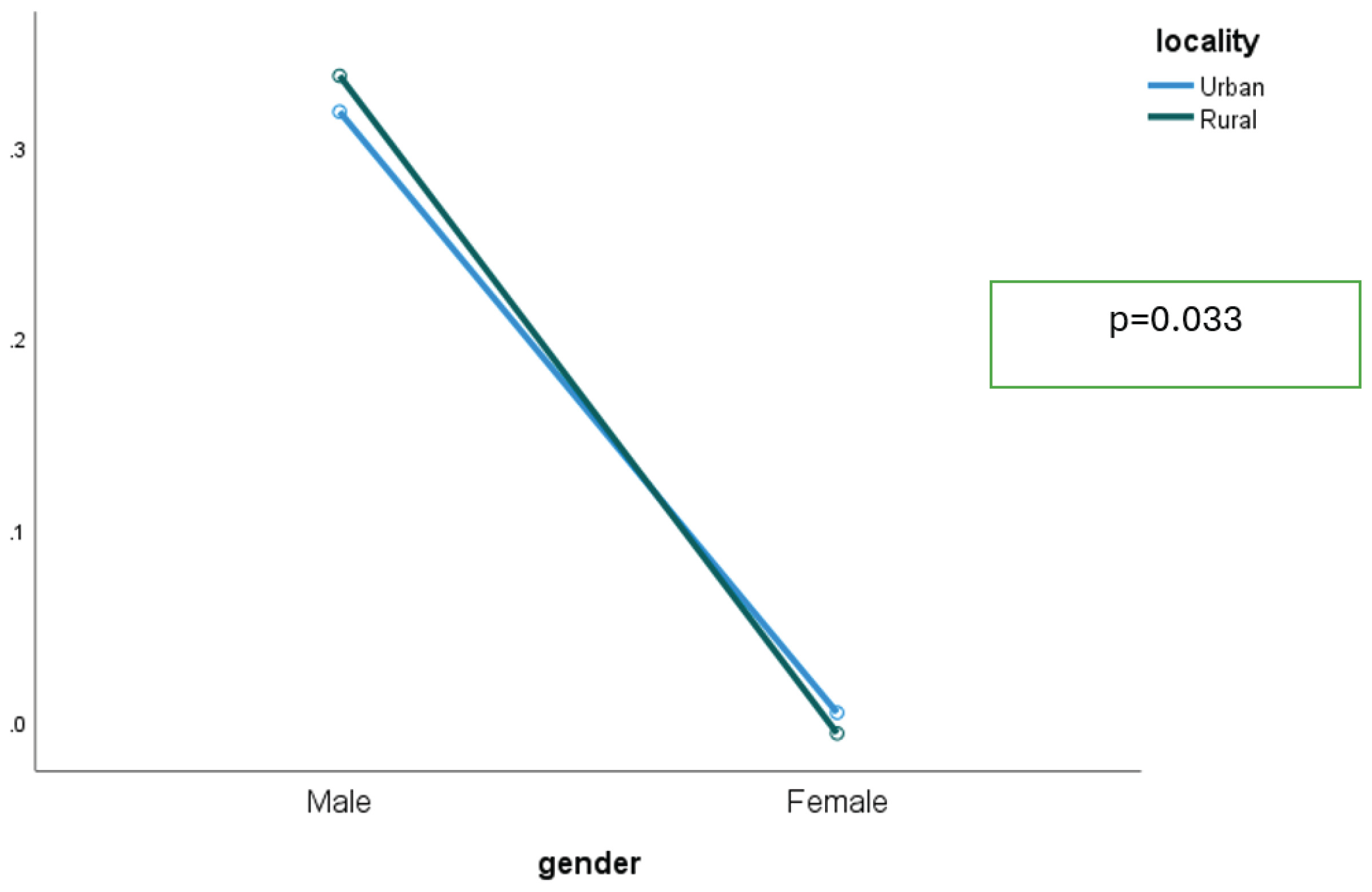 Smoking prevalence was markedly higher among males than females in both urban and rural areas. Rural males smoked slightly more than urban males, while among females, prevalence was negligible regardless of residence. The gender gap remained wide across residence, indicating only a weak interaction effect (Figure 1).