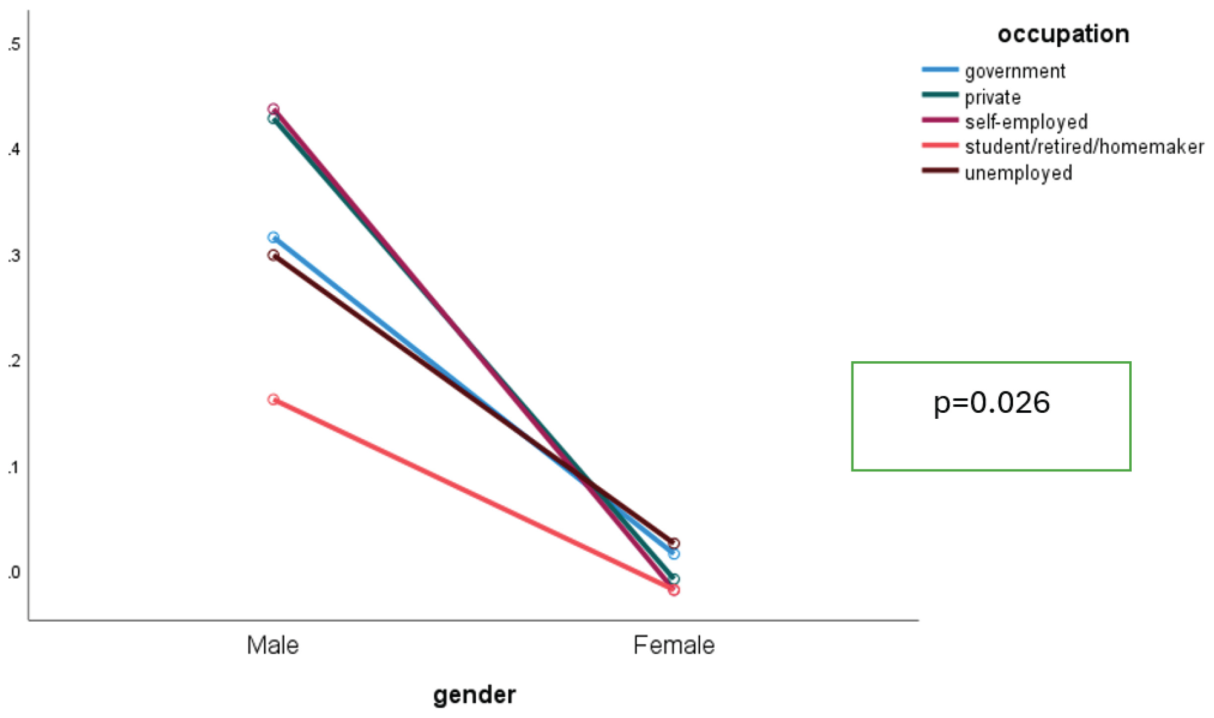 Figure 2 illustrates the interaction between gender and type of occupation, showing a higher probability of being current smokers among male respondents working in the private sector and self-employed compared to their counterparts in the government sector. Males consistently smoked more than females, but the size of the gender gap varied by occupation. The gap was widest among the self-employed, unemployed, and student/retired/homemaker groups, where female smoking was minimal. In contrast, in the government and private sectors, both sexes smoked more, narrowing the relative difference. This non-parallel pattern indicates an interaction between gender and occupation (Figure 2).
