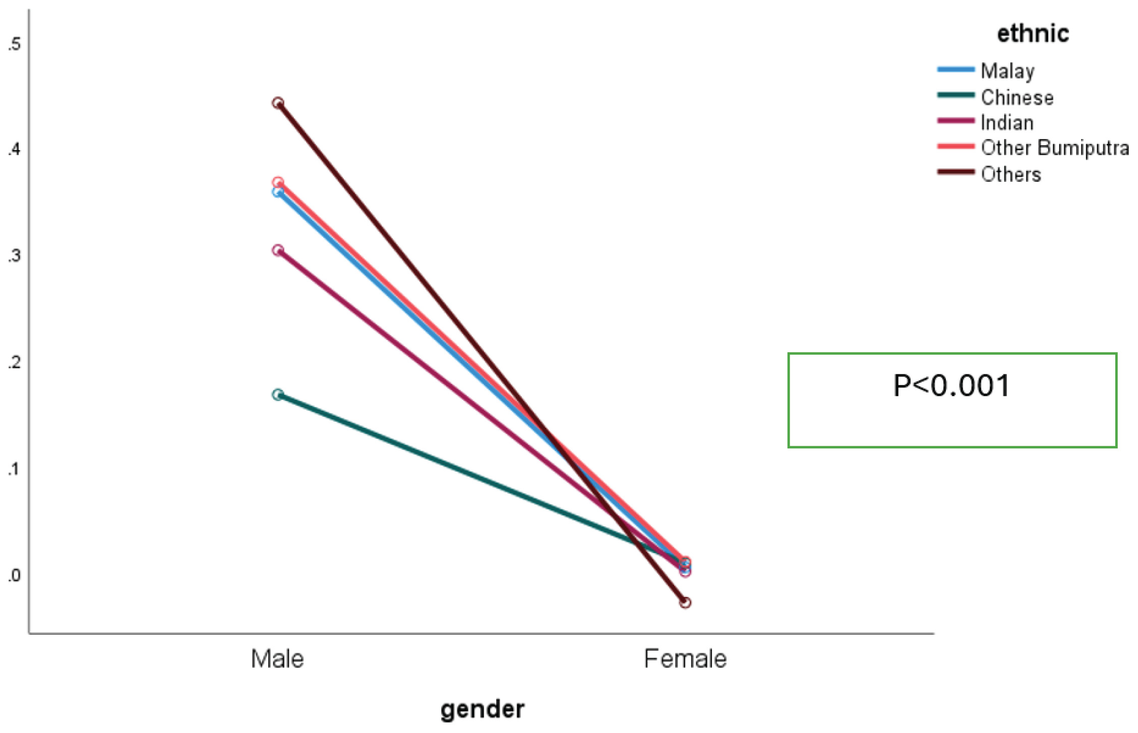 The interaction between gender and ethnicity showed that males smoked far more than females across all ethnic groups, while female prevalence was negligible. Among males, smoking rates varied by ethnicity – highest among ‘Other’ and ‘Other Bumiputra’, and lowest among Chinese. This indicates a weak interaction: ethnicity shapes smoking mainly among males, but the gender gap remains wide across all groups (Figure 3).