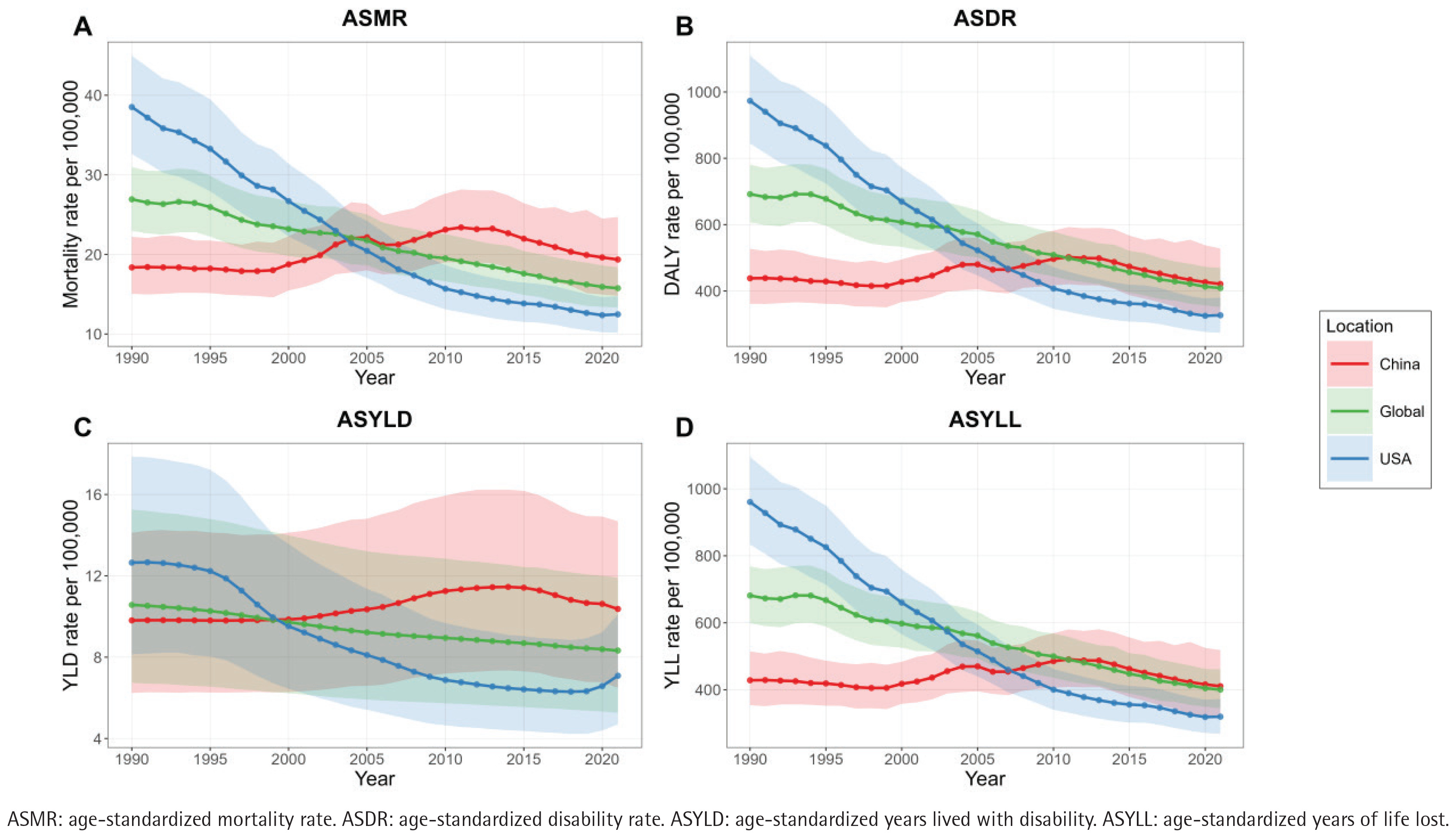 Joinpoint regression analysis of ASMR, ASDR, ASYLD, and ASYLL trends in smoking-related IHD in China (1990–2021)