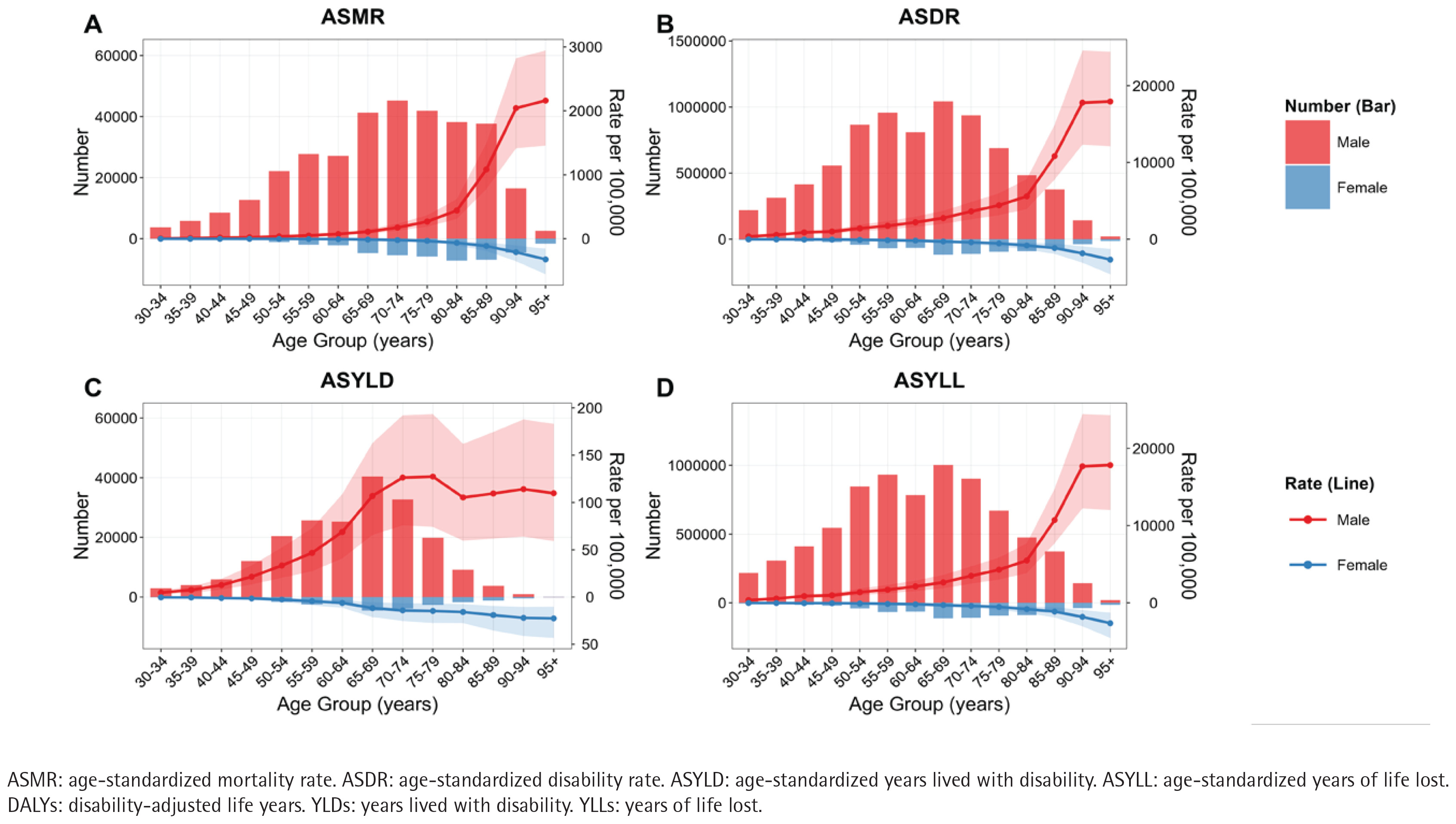 Most deaths occur in the age group of 60–89 years, while the peak ASMR is observed in the age group of ≥90 years (Figure 2A). The DALYs are mainly concentrated in the age group of 50–79 years, with the highest ASDR also occurring in those aged ≥90 years (Figure 2B). The YLDs are predominantly found in the 50–79 years group, while the ASYLD remains elevated after the age of 70 years (Figure 2C). The YLLs are primarily concentrated in the 50–79 years group, with the peak ASYLL occurring in those aged ≥90 years (Figure 2D).