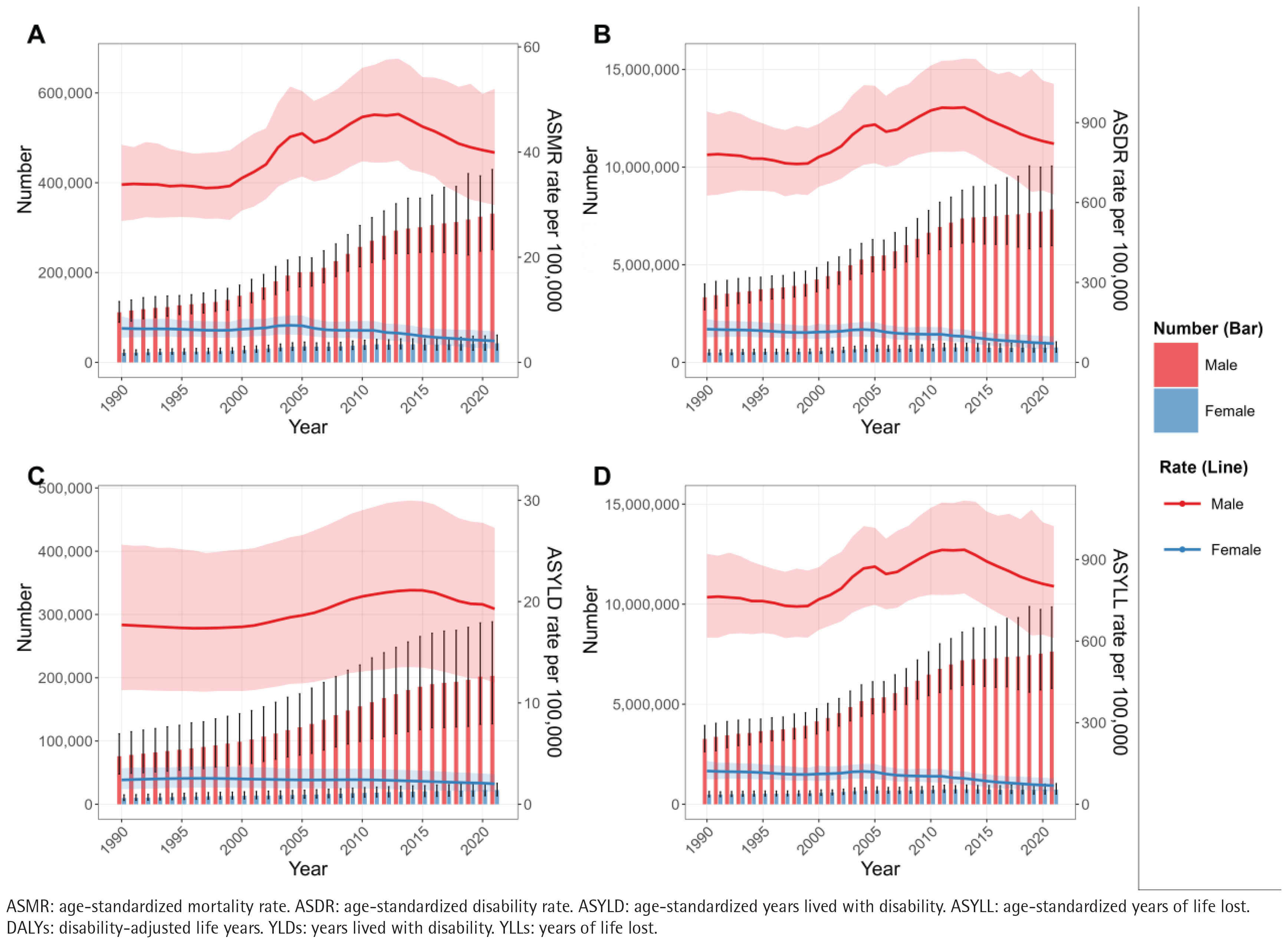 Overall, the disease burden is significantly higher in males compared to females. Specifically, the number of deaths for males is 331587 (95% UI: 251500–429418) versus 42236 (95% UI: 27752–60634) for females, resulting in an ASMR of 39.9 (95% UI: 29.92–52.05) per 100000 for males compared to 4.08 (95% UI: 2.63–5.9) per 100000 for females (Figure 2A, Table 2). The DALYs for males stand at 7834073 (95% UI: 5977996–10052681) versus 759830 (95% UI: 52396–1050934) for females, with an ASDR of 820.81 (95% UI: 630.03–1045.28) per 100000 for males and 70.48 (95% UI: 48.36–98.16) per 100000 for females (Figure 2B, Table 2). The YLDs for males are 203043 (95% UI: 127224–288389) compared to 22470 (95% UI: 13319–33049) for females, with an ASYLD of 19.28 (95% UI: 12–27.29) per 100000 for males versus 2.01 (95% UI: 1.21–2.96) per 100000 for females (Figure 2C, Table 2). The number of YLLs for males is 7631031 (95% UI: 5786889–9859840) compared to 737361 (505820–1030964) for females, with an ASYLL of 801.52 (95% UI: 611.2–1023.37) per 100000 for males versus 68.47 (95% UI: 46.77–96.1) per 100000 for females (Figure 2D, Table 2).