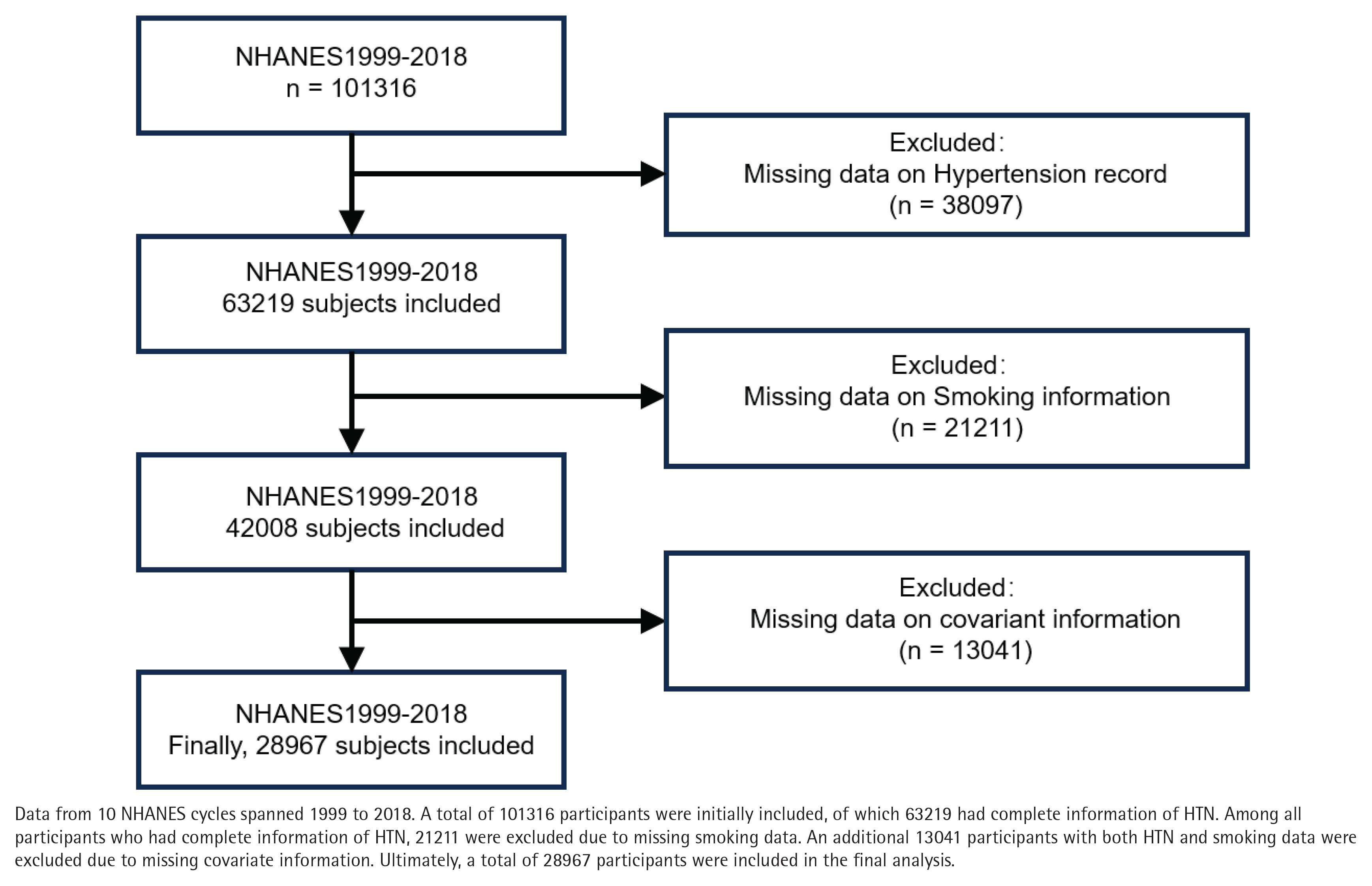 Data from 10 NHANES cycles between 1999 and 2018 were analyzed, comprising 101316 participants. After excluding 13041 participants due to missing covariate data, the final analysis included 28967 participants, representing the largest retrospective clinical study to date examining the relationship between smoking and HTN (Figure 1).