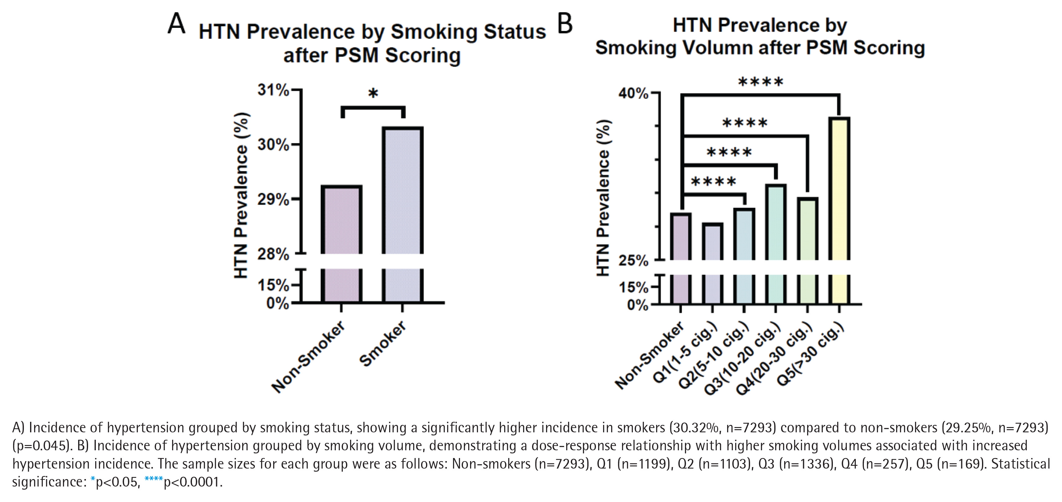 Statistical analysis of the matched dataset revealed that 30.32% of smokers had HTN compared to 29.25% of non-smokers, demonstrating a significant increase in the likelihood of HTN among smokers (p=0.045) (Figure 4A). Further stratification by smoking volume showed a significant increase in HTN incidence among smokers, with the highest prevalence (37.81%) in participants smoking >30 cigarettes/day (p<0.0001) (Figure 4B).