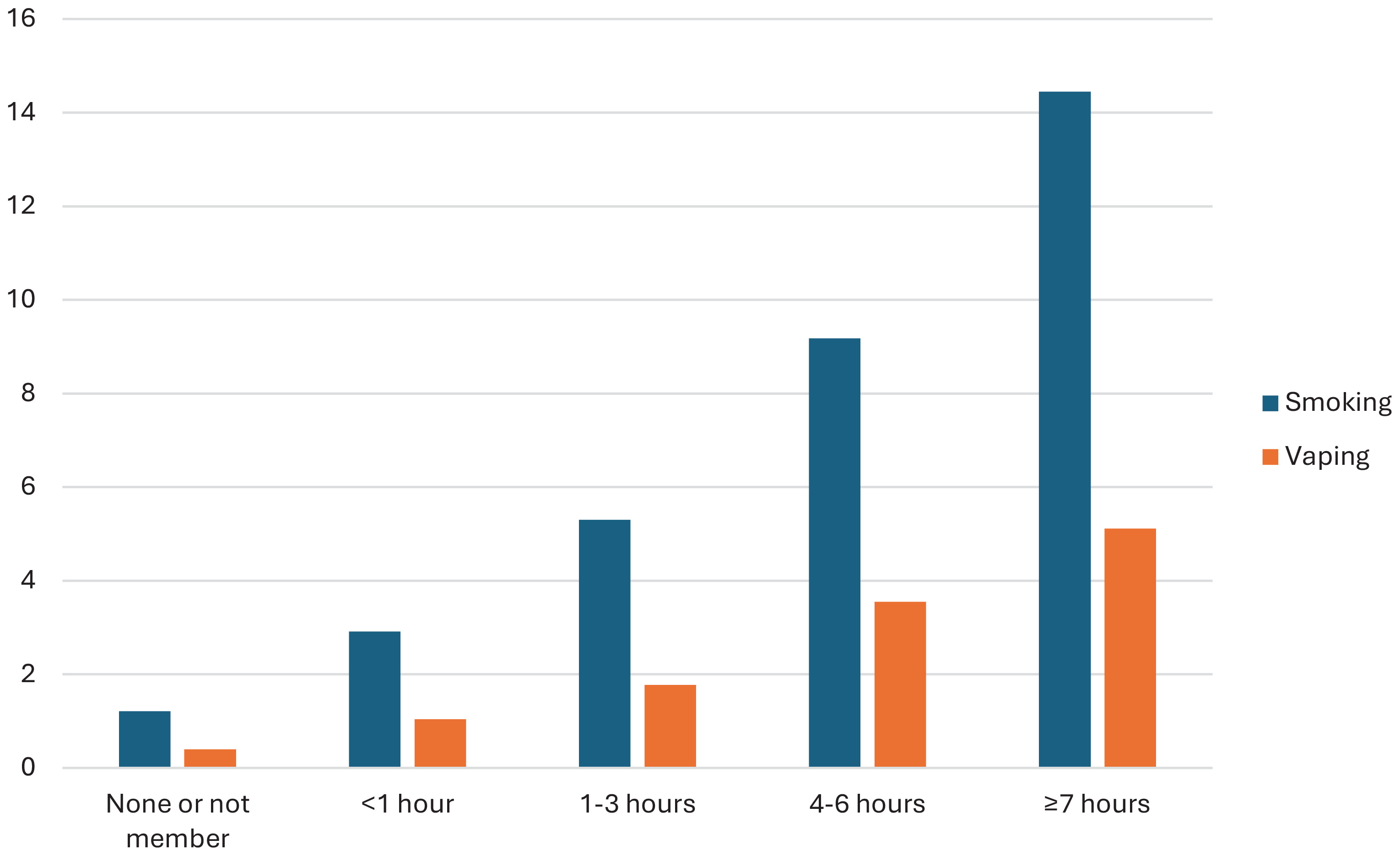 We analyzed data from 2015–2016 to 2022–2023. Outcomes were current cigarette smoking and current e-cigarette use (both defined as use at least once per week). Exposure was assessed with the question: ‘On a normal week day, that is Monday to Friday, how many hours do you spend chatting or interacting with friends through social media, gaming websites or apps?’ with responses ‘none or not a member’, ‘less than an hour’, ‘1–3 hours’, ‘4–6 hours’ and ‘≥7 hours’. Possible confounders were age (continuous), sex (binary), UK nation (England, Scotland, Wales, Northern Ireland), ethnicity (White, non-White), household income in three groups, and parental tobacco or e-cigarette use. Model building was based on prior research and data availability. All tests were two tailed with a statistical significance threshold of p<0.05 and analyses were conducted in Stata.