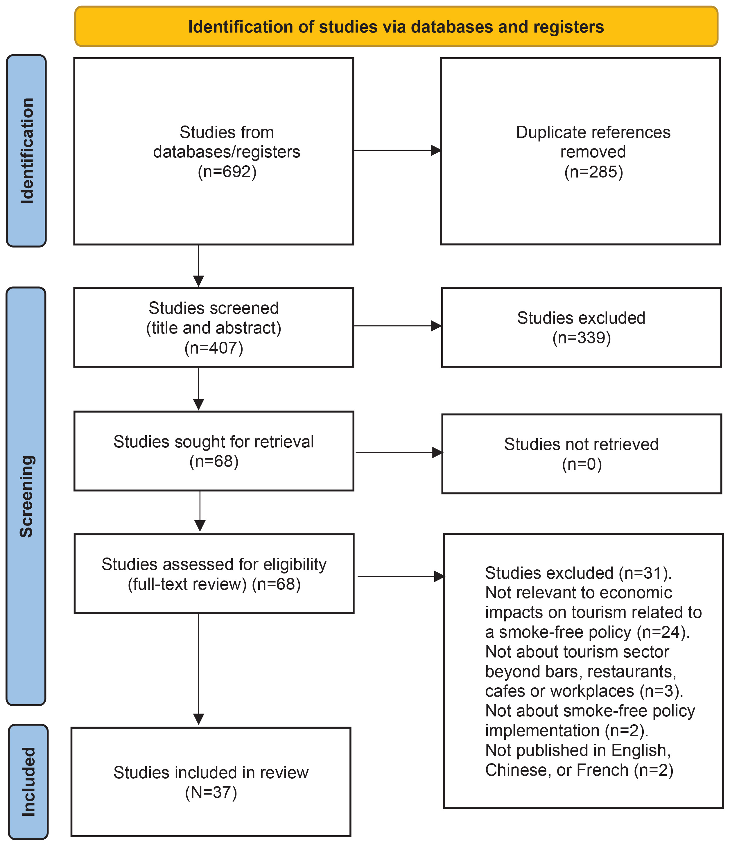 The search produced 692 articles; 285 articles were duplicates and were removed. The title and abstract review identified 407 articles for full text review, which were screened by one coder. This process identified 68 articles that met the inclusion criteria and underwent full-text review by two independent coders. Following full-text review, 31 articles were excluded because they did not present findings relevant to direct or indirect economic impacts on tourism related to a smoke-free policy (24 articles), were not about tourism sector beyond bars/ restaurants/cafes or workplaces (3 articles), were not about smoke-free policy implementation (2 articles), or were not published in English (2 articles). The final sample included in the study was 37 (Figure 1).