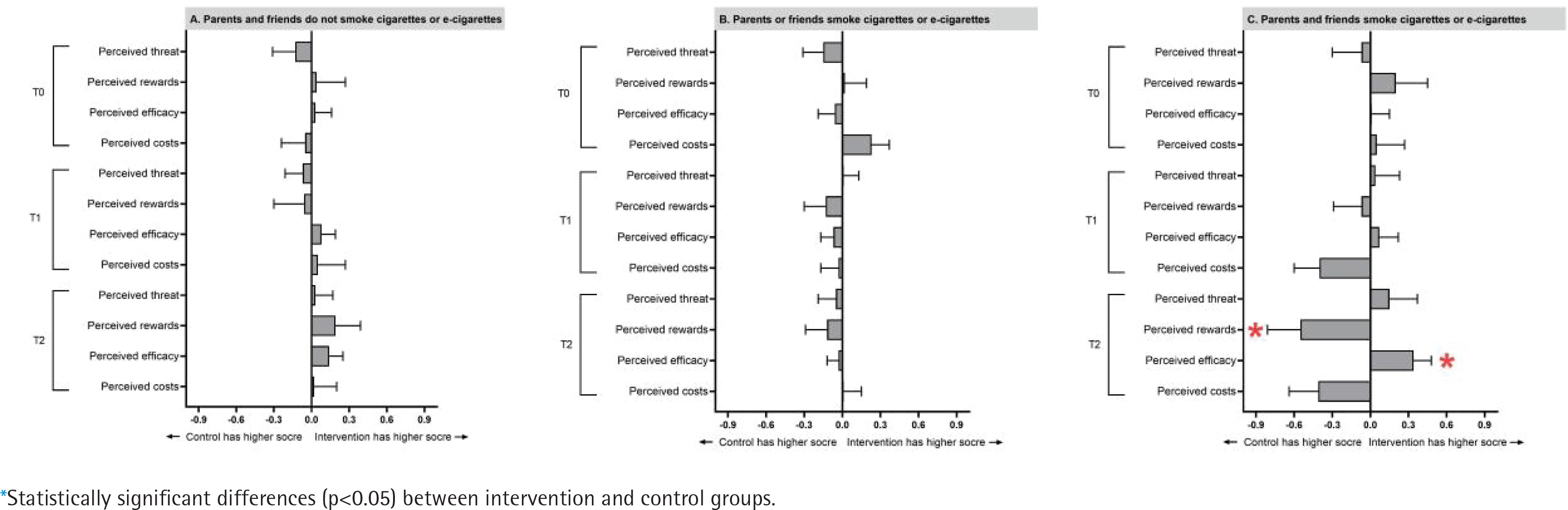To examine whether other people’s smoking/ vaping status affects cognition of e-cigarettes, we stratified the sample by parents’ and friends’ smoking and vaping status. Figure 3 and Table 3 show the mean difference in the subgroup analysis. We found that the intervention group had significantly lower perceived rewards of e-cigarette use (mean difference= -0.55; SD=0.26; p=0.04) and significantly greater perceived efficacy of refusing e-cigarettes (mean difference= 0.34; SD=0.14; p=0.02) at 3 months if they had parents and friends who use cigarettes/e-cigarettes.