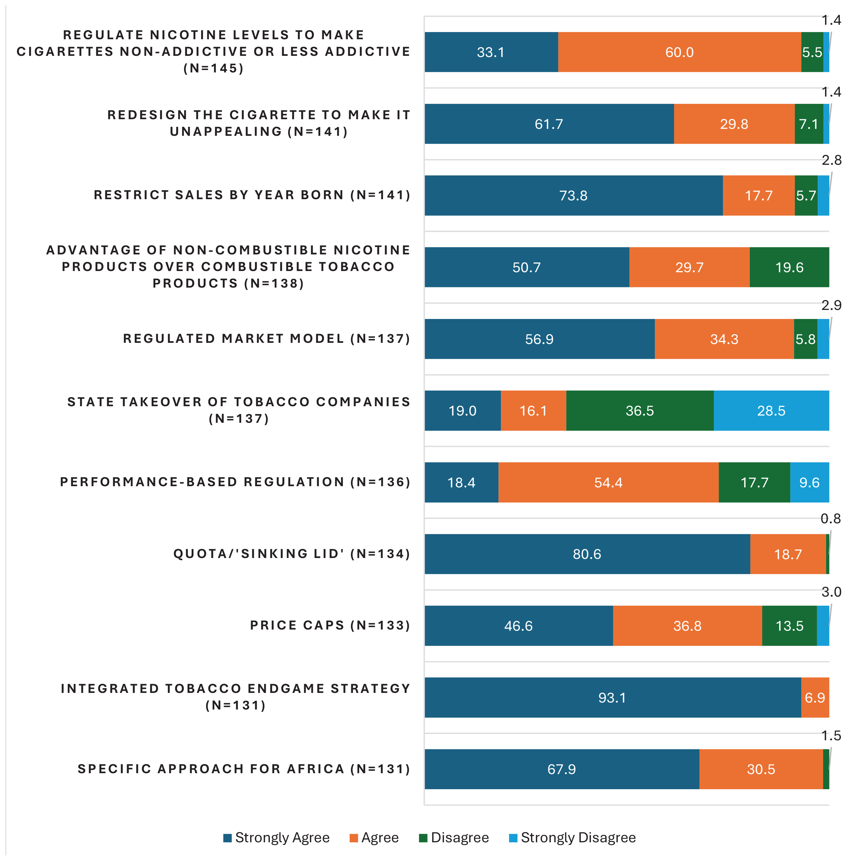 Figure 1 details participants’ level of agreement with various endgame approaches. For ease of interpretation, the variables which were measured on a 4-point Likert scale (strongly agree, agree, disagree, strongly disagree) were collapsed into two categories: agree (strongly agree and disagree) and disagree (strongly disagree and disagree). Participants supported regulating nicotine levels to make cigarettes non-addictive or less addictive (93.1%), redesigning the cigarette to make it unappealing (91.5%), restricting sales by year of birth (91.5%), advantage of non-combustible nicotine products over combustible tobacco products (80.4%), regulated market model (91.2%), performance-based regulation (72.8%), quota/sinking lid model (99.3%) and price caps (83.5%). The use of an integrated approach (100%) and designing a specific approach for Africa (98.5%) received the highest support while only 35% of participants supported State takeover of tobacco companies.