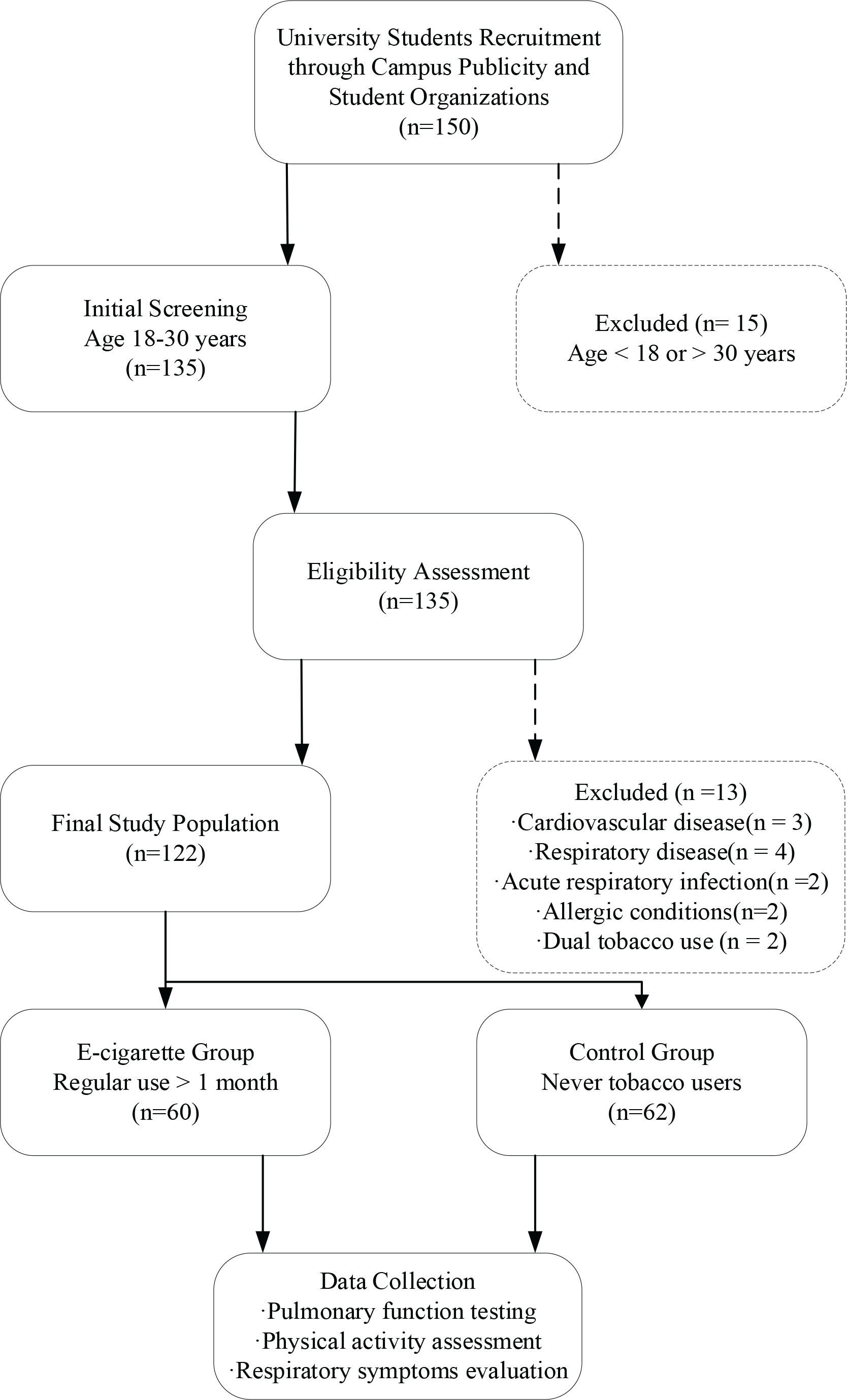 This cross-sectional observational study was conducted in accordance with the Strengthening the Reporting of Observational Studies in Epidemiology (STROBE) statement15 and implemented at a university in [specific city/province], China, from January to August 2024. Sample size calculations were based on preliminary Dyspnoea-12 score differences with an anticipated effect size of d=0.5, derived from preliminary data and previous literature on respiratory symptoms in young adult populations16,17, alpha level of 0.05, and power of 1-β=0.90, accounting for a 10% attrition rate, yielding a requirement of approximately 60 participants per group. The final enrollment comprised 60 participants in the e-cigarette group and 62 participants in the control group, for a total sample of 122 individuals. University students aged 18–30 years were recruited through campus publicity and student organization networks. The e-cigarette group comprised regular users with ≥1 month of consistent usage, while the control group consisted of individuals who had never used any tobacco products. Exclusion criteria encompassed participants with cardiovascular or respiratory disease history, acute respiratory infections within the preceding four weeks, diagnosed allergic conditions, traditional tobacco use history, or dual product usage patterns. The recruitment and screening process, as illustrated in Figure 1, resulted in the enrollment of 60 participants in the e-cigarette group and 62 participants in the control group, achieving the target sample size for adequate statistical power.